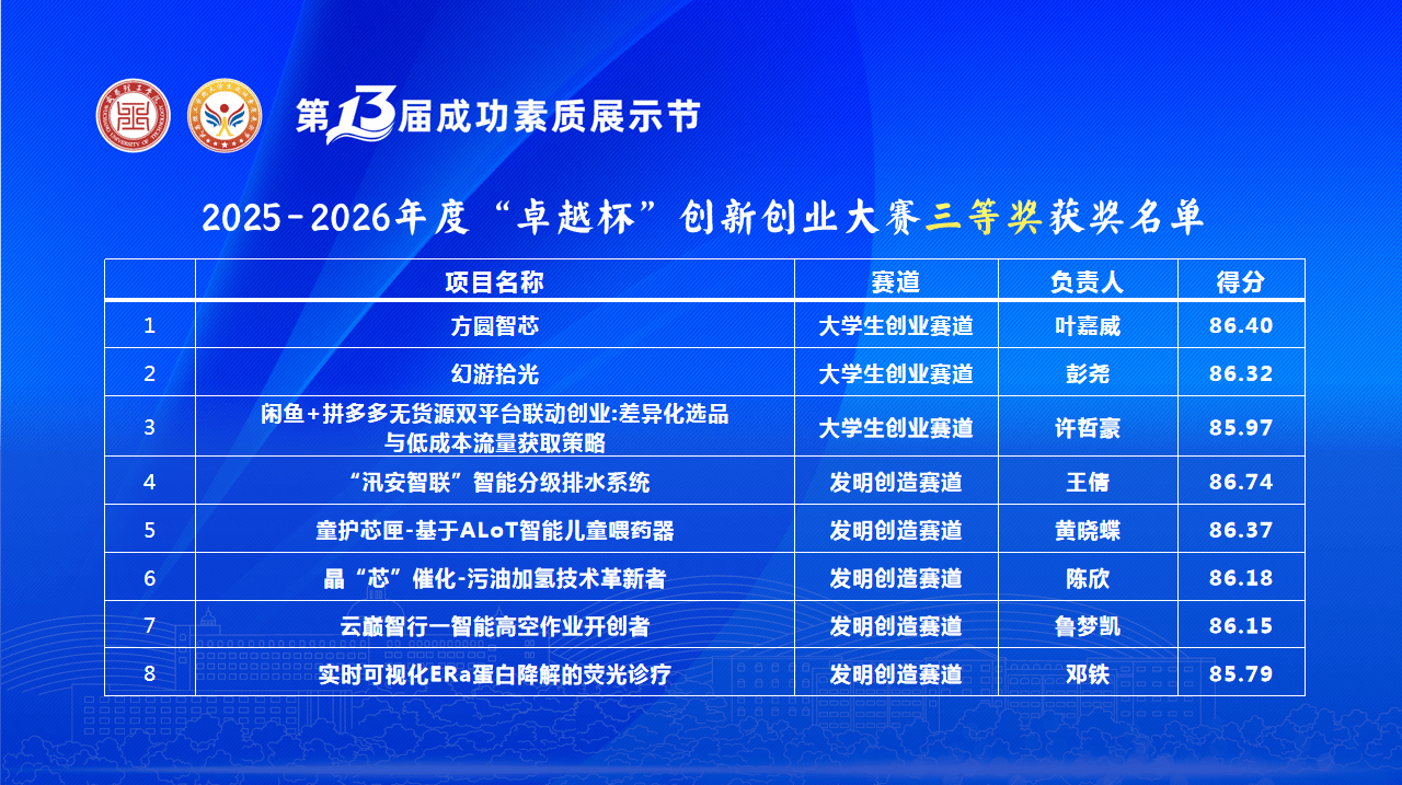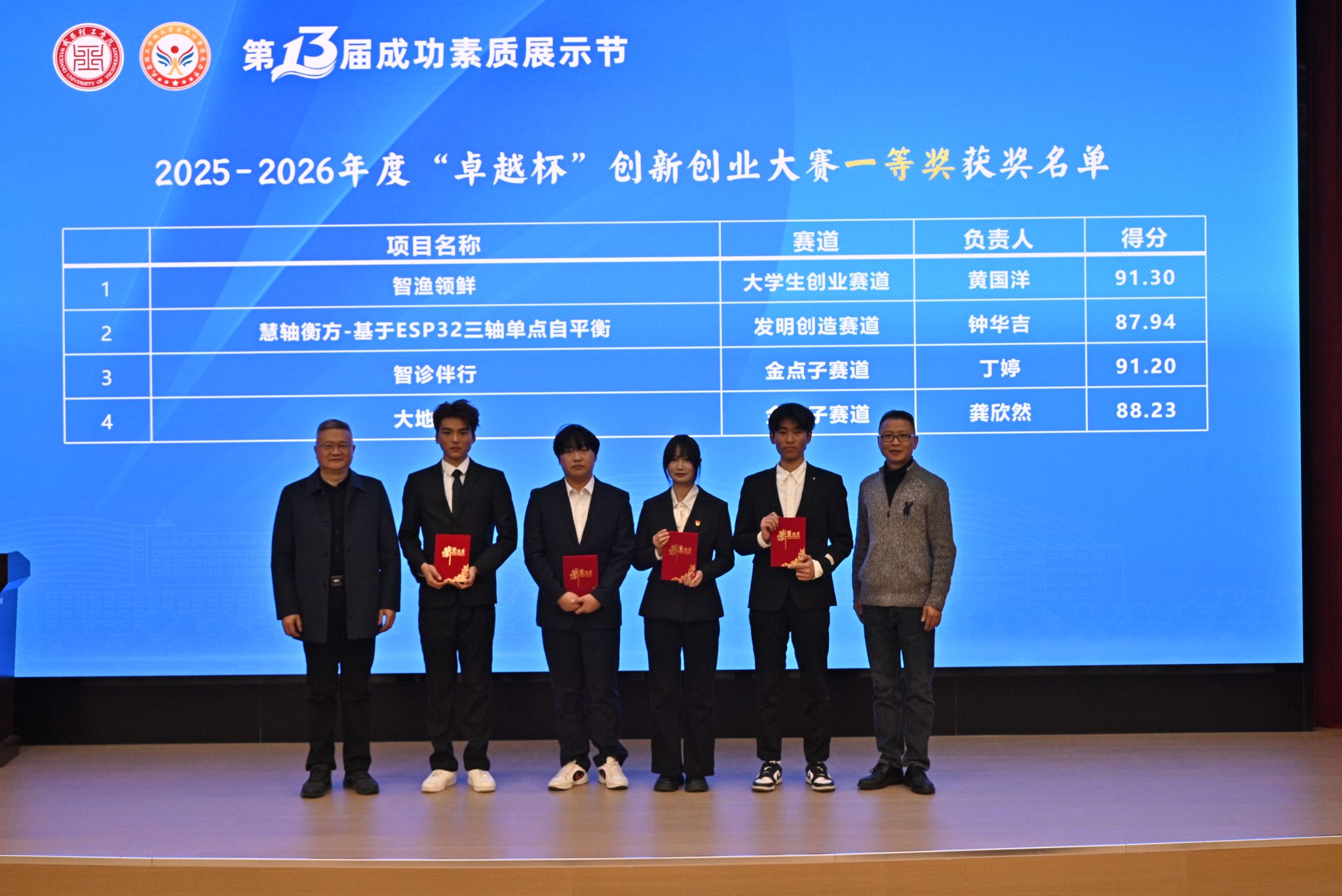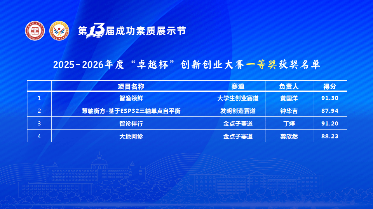 各赛道涌现出一批亮点项目。其中,《智渔领鲜》项目凭借清晰的商业模式与较强的实践潜力,以91.30分荣获大学生创业赛道一等奖。项目负责人黄国洋结合家庭渔业背景,针对传统水产销售痛点,带领团队开发出集智能监测、品质溯源与电商销售于一体的解决方案。此外,钟华吉团队的《慧轴衡方-基于ESP32三轴单点自平衡》项目获得发明创造赛道一等奖;丁婷团队的《智诊伴行》项目、龚欣然团队的《大地问诊》获得金点子赛道一等奖。