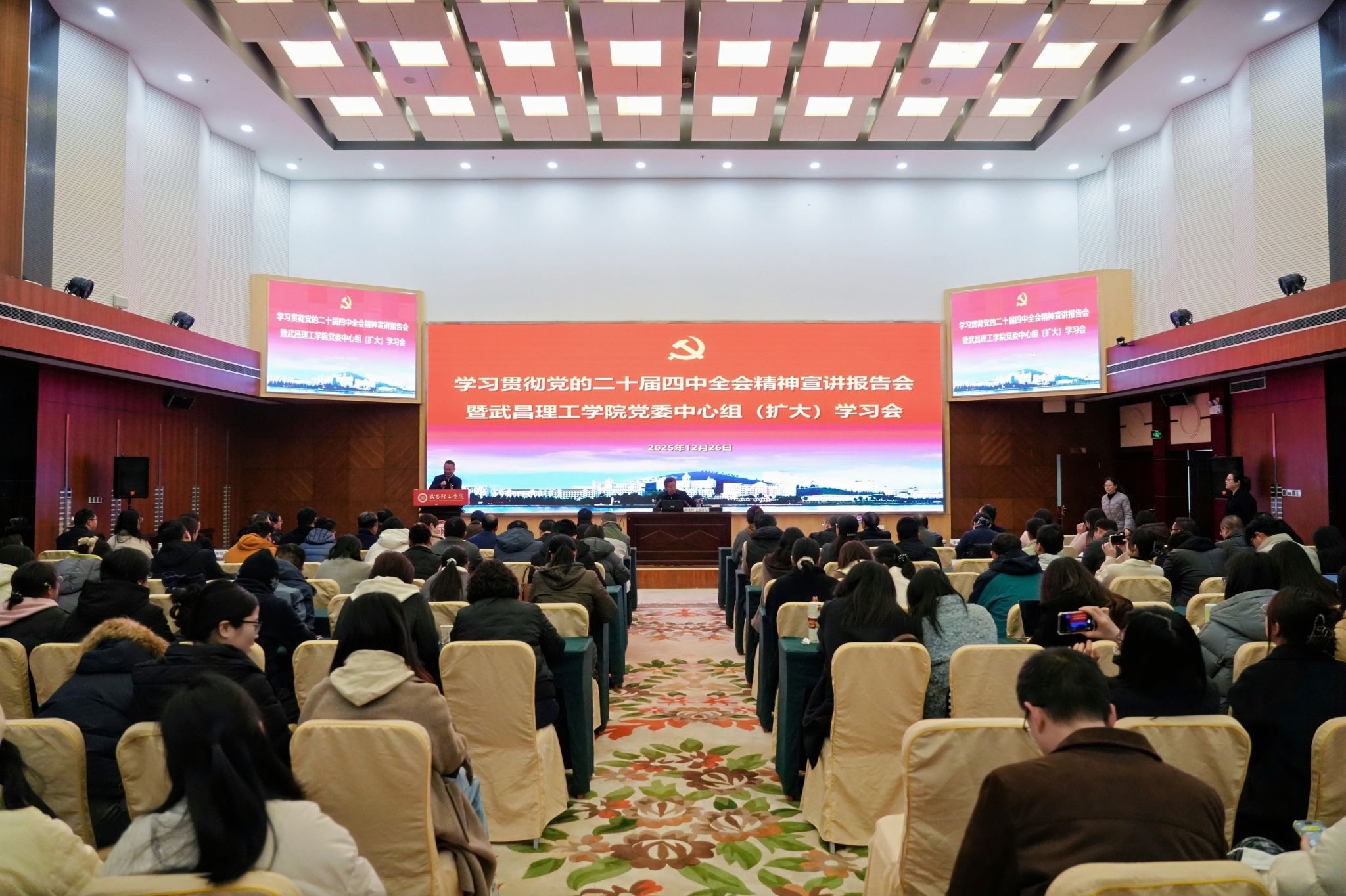 中南在线12月26日消息(记者 祝琳 报道 实习生 苏紫微 摄影摄像中心 雷梦婷 冯佳林 拍摄)12月26日,武昌理工学院举行学习贯彻党的二十届四中全会精神宣讲报告会暨校党委理论学习中心组(扩大)学习会。湖北省委宣讲团成员、省委直属机关工委常务副书记陈正祥应邀来校作专题报告。
