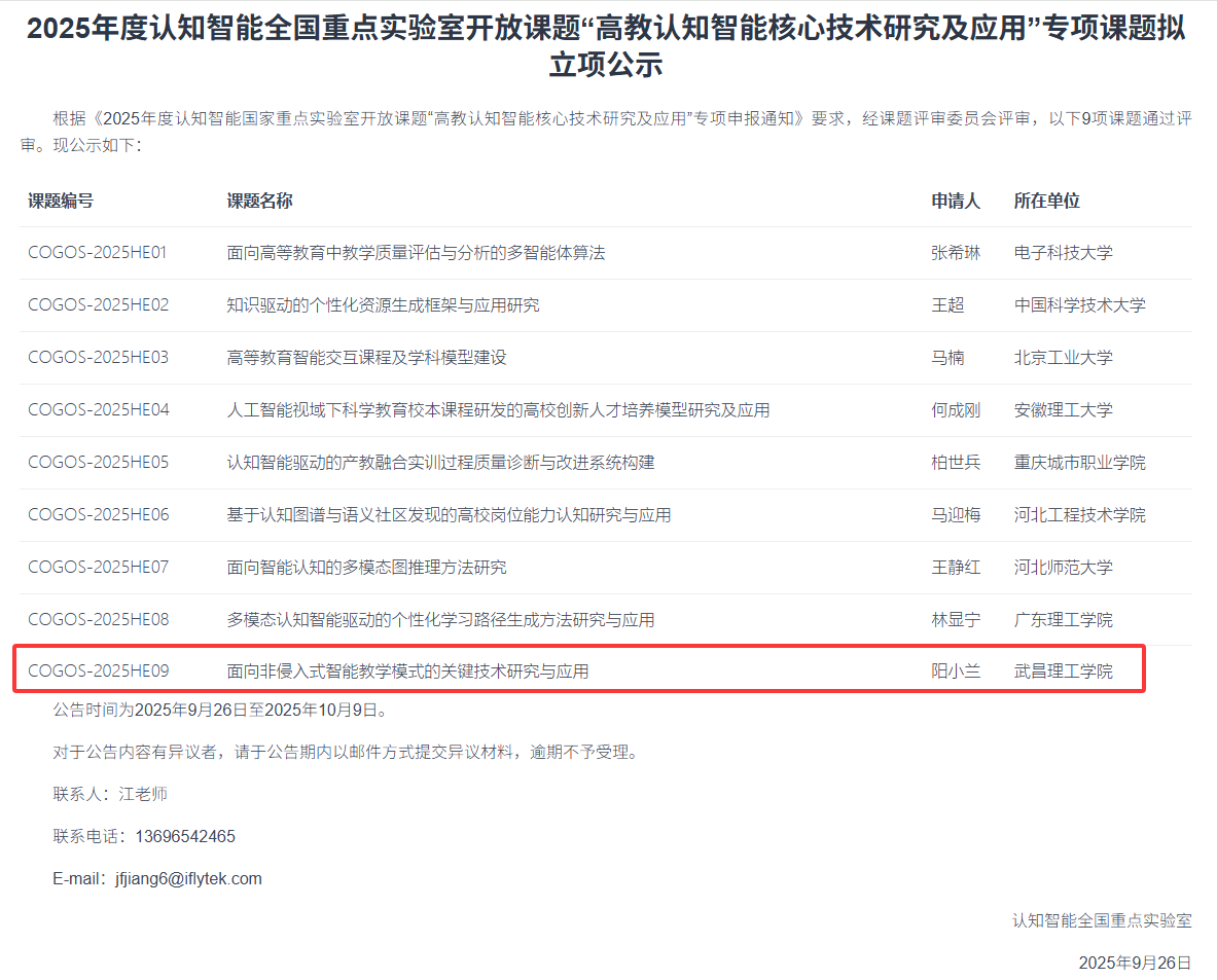中南在线1月16日消息(记者 周黎 报道)近日,认知智能国家重点实验室公布2025年度开放课题“高教认知智能核心技术研究及应用”专项课题拟立项名单,武昌理工学院人工智能学院阳小兰副院长申报的《面向非侵入式智能教学模式的关键技术研究与应用》成功获批。