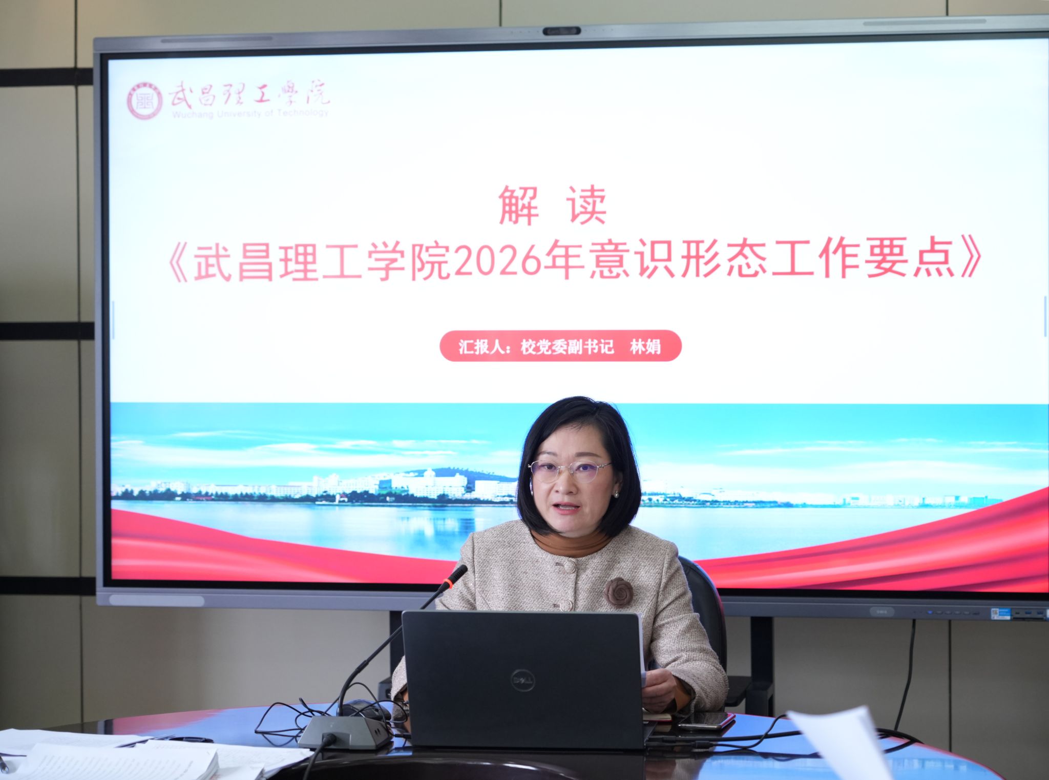 校党委副书记林娟同志详细解读了《武昌理工学院2026年意识形态工作要点》,并从着力筑牢思想根基、拧紧责任链条、强化阵地管理、加强文化建设、防范化解风险、建强工作队伍等六个方面,对2026年学校意识形态重点工作进行了全面部署。