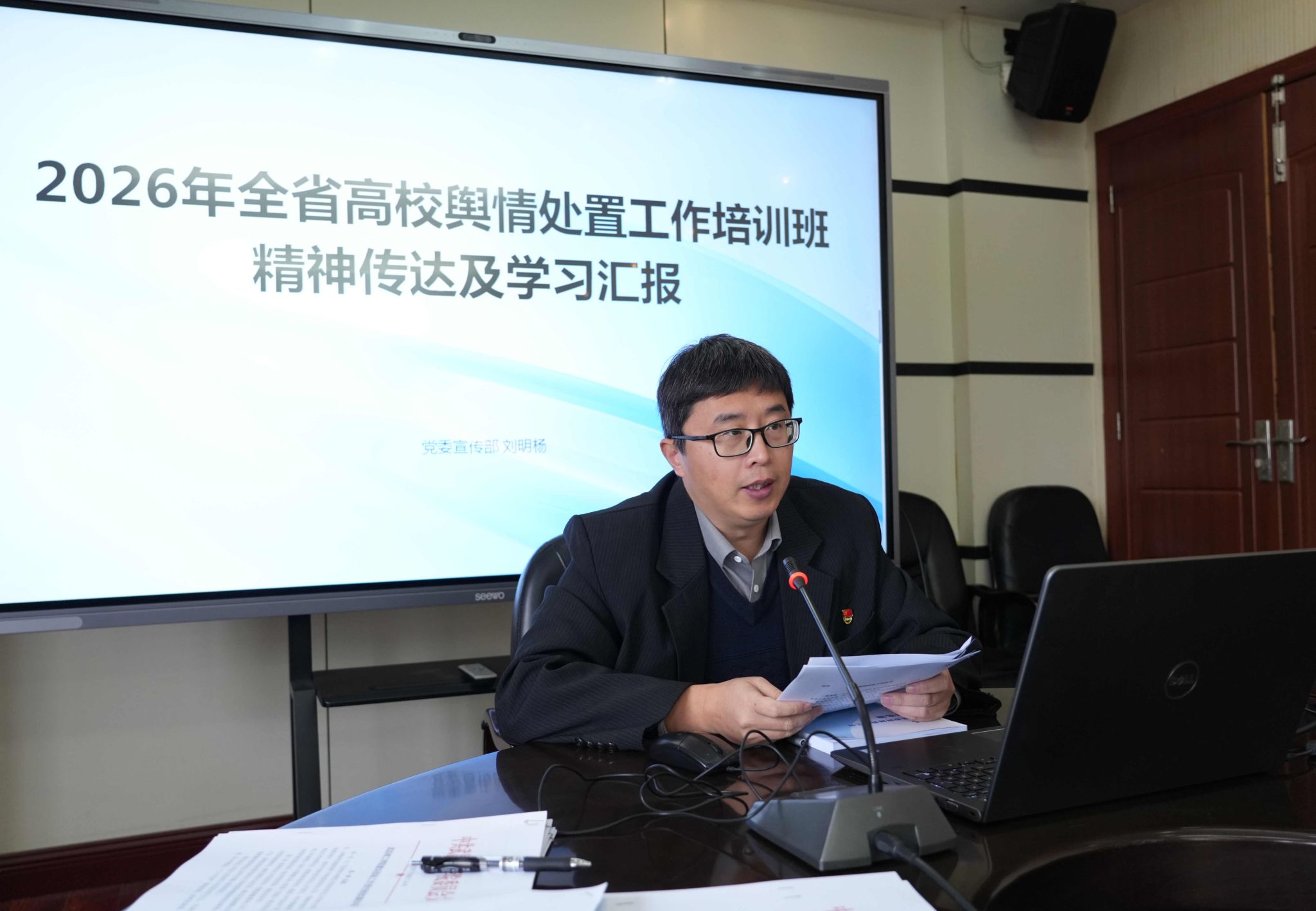 会上,校党委宣传部祝琳同志传达学习了《党委(党组)网络意识形态工作责任制实施细则》精神;校党委宣传部负责人刘明杨同志传达学习了2026年全省高校舆情处置工作培训班精神,通报了2025年学校意识形态领域相关情况,并对学校新出台的《武昌理工学院网络舆情管理与应急处置办法》进行了解读。
