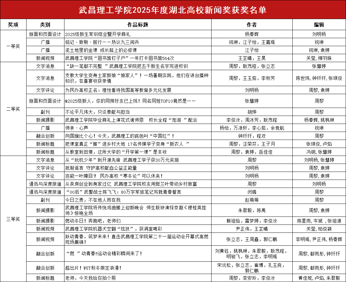 在2025年度评选中,武昌理工学院的获奖作品涵盖了文字、摄影、视频等多个领域。获奖作品紧扣时代脉搏,聚焦学校在人才培养、校园文化、师生风采等方面的突出成就。其中,《泥土地里的金课 成长路上的必修课》《铭记·致敬·前行——热议九三阅兵》荣获广播类作品一等奖,《武昌理工学院“ 图书馆钉子户 ”一年打卡图书馆564次》荣获新闻视频类作品一等奖,《2025级新生军训结业暨开学典礼》荣获版面和页面设计类作品一等奖。