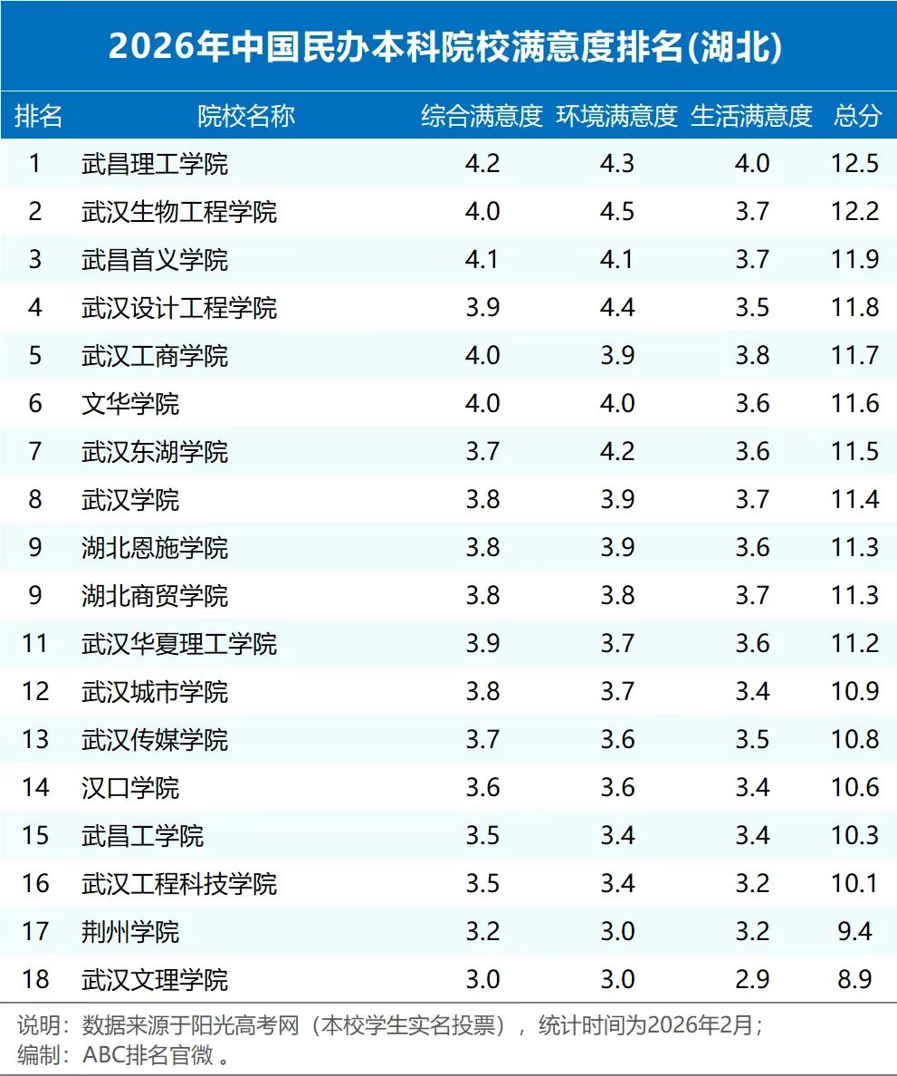 中南在线3月19日消息 (记者 周黎 报道)3月18日,ABC排名发布2026年各省民办本科院校满意度排名(含独立学院)榜单,武昌理工学院在众多院校中脱颖而出,位列湖北省民办本科院校满意度榜首。