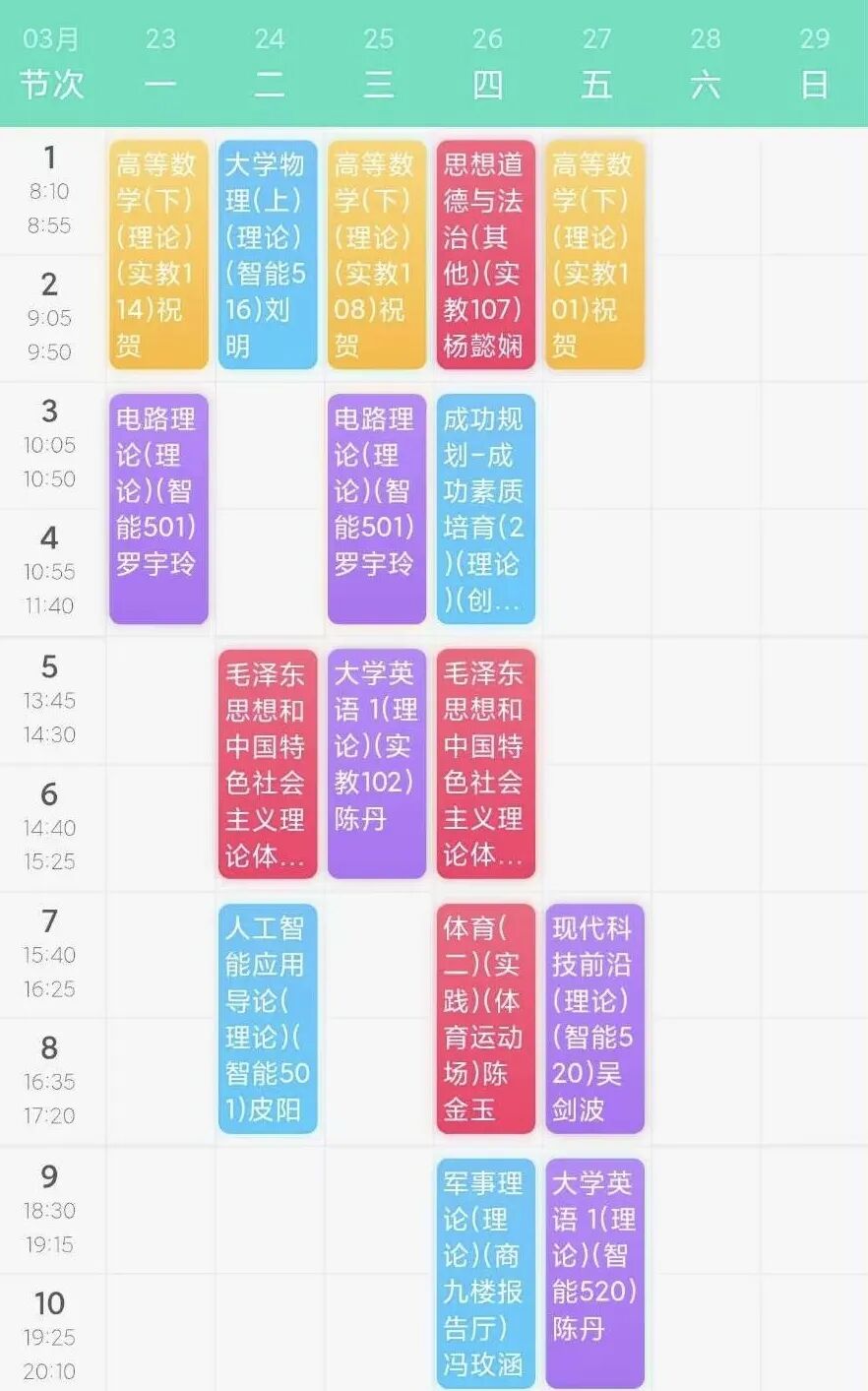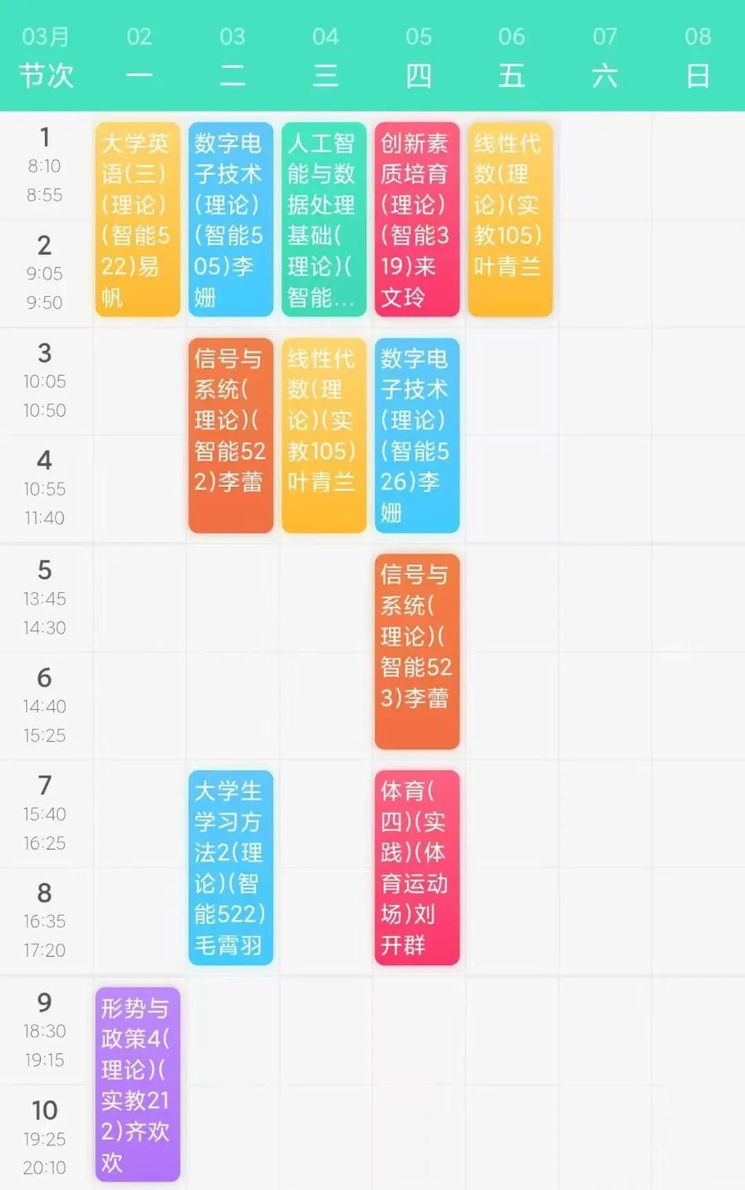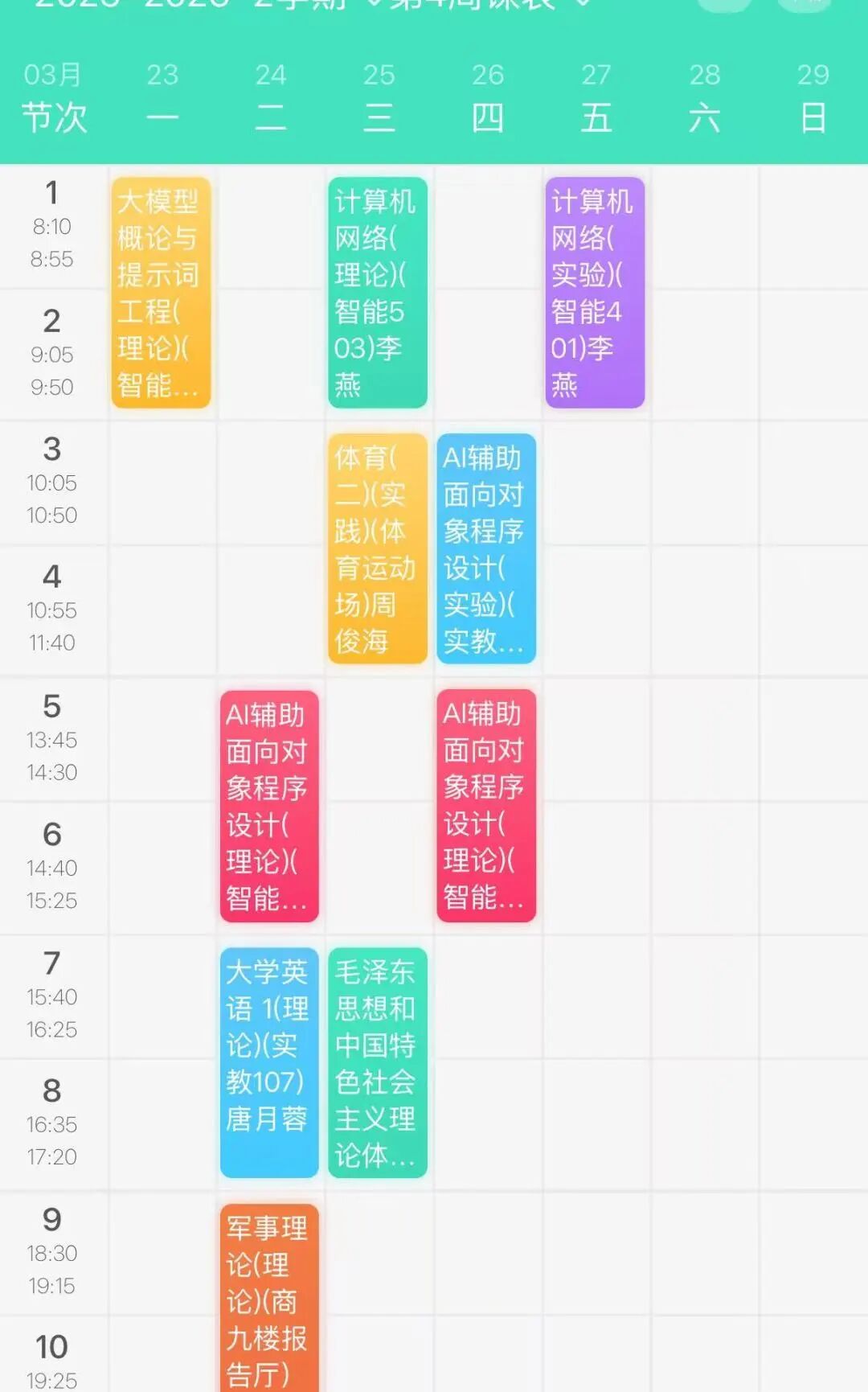 人工智能学院计算机网络技术专业朱婧怡同学分享:“我的课表真的像坐过山车一样刺激!这段时间最大的收获,就是学会了跟忙碌和解,把课间、赶路的碎片化时间都利用起来,在奔波里悄悄抓住每一份成长。虽然每天忙忙碌碌,但看着自己慢慢适应、慢慢进步,真的超有成就感!”