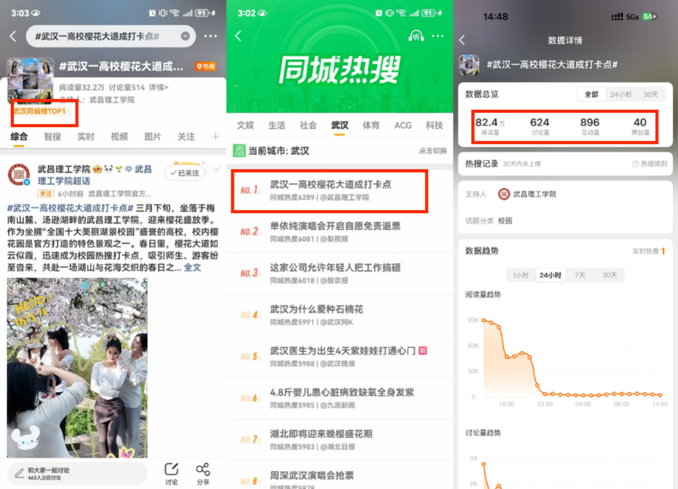 学校官方微博发布的内容上榜热门微博,策划的话题#武汉一高校樱花大道成打卡点#登上微博热搜,位于微博同城热搜榜第1位,话题总阅读量达82.3万次,被武汉校园等微博大V转发互动,引发广泛关注和讨论。宣传处还制作了系列校园樱花短视频,总播放量超10万次。
