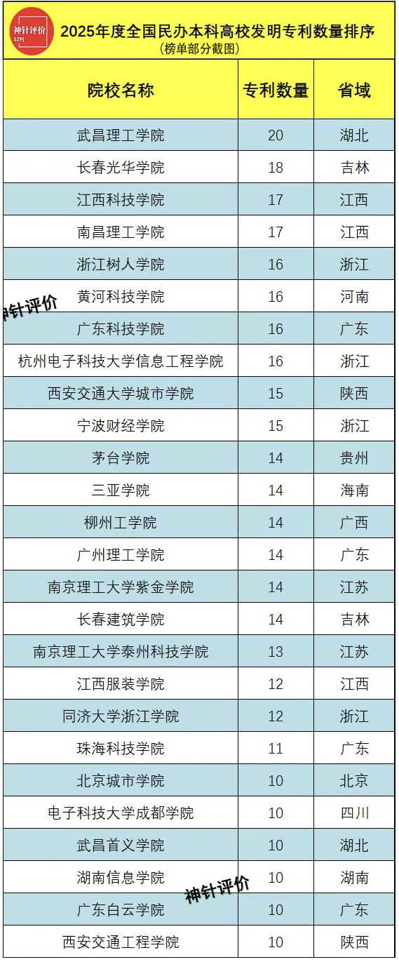 中南在线4月13日消息 (记者 周黎 报道)近日,神针评价(SZPJ)研究团队发布2025年全国民办本科高校发明专利授权数据。数据显示,武昌理工学院在发明专利授权数量上表现突出,以20件的专利数量,位居全国同类高校前列、湖北省同类高校第一。
