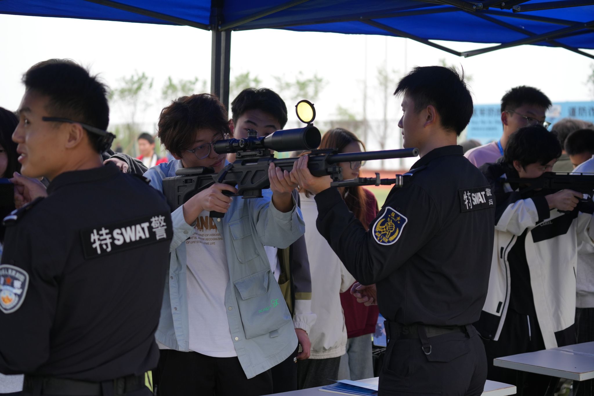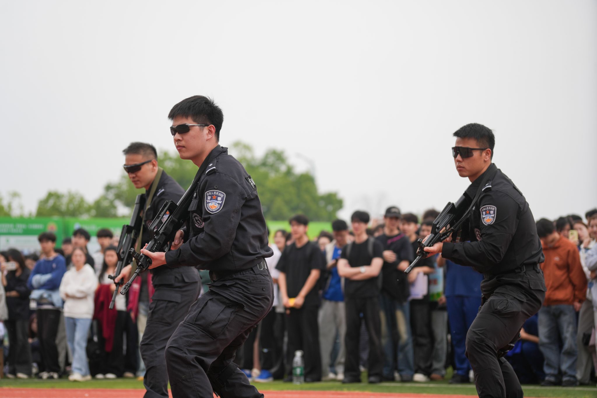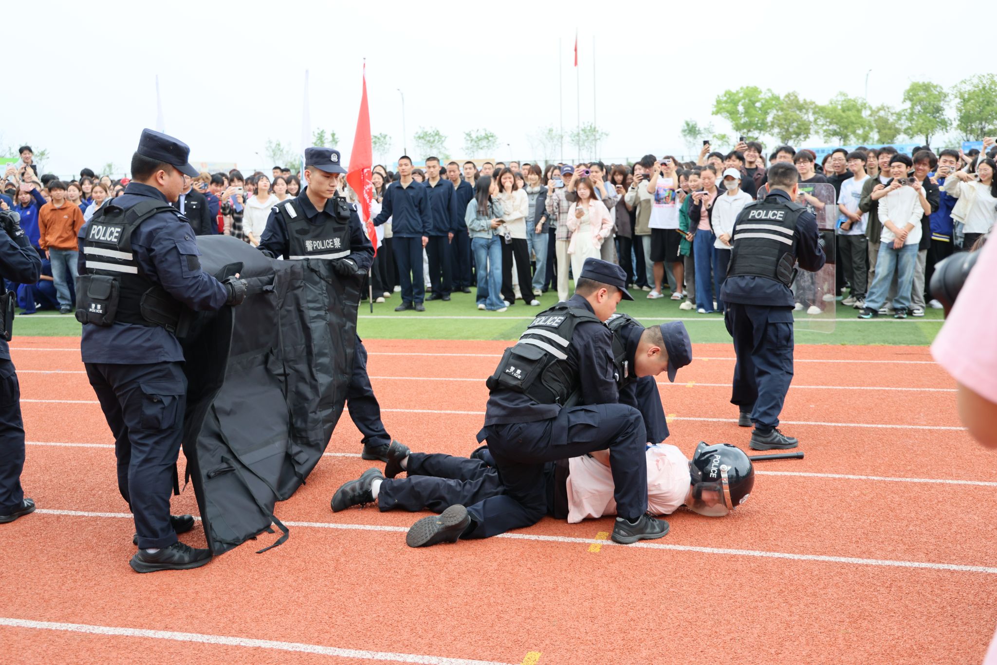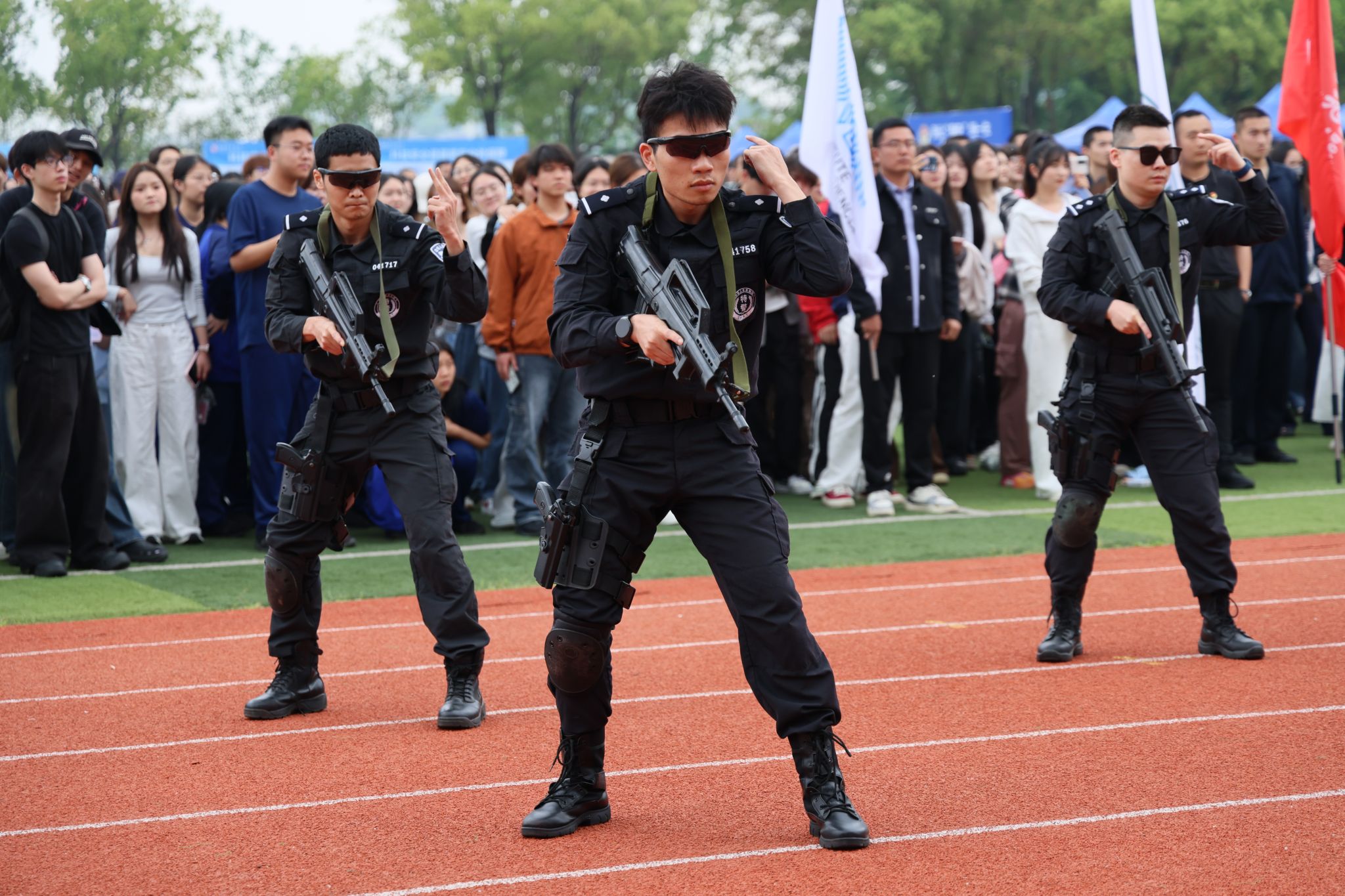 活动现场的实战化展示环节亮点纷呈,让在场学子直观感受国家安全守护的力量。武昌职业学院学生操控无人机,先后完成穿越机拉烟飞行、固定翼特技飞行、穿越机精准扎破气球、命中靶心及中型无人机拉旗伴飞等一系列高难度动作,生动模拟了对非法入侵目标的实时监测与处置过程。武汉市公安局反恐怖和特警支队带来震撼的战术枪操表演,展示刺杀术、长短枪互换、战术手语等科目,动作规范有力、节奏紧凑有序。江夏区公安分局郑店公安检查站则模拟校园暴恐袭击场景,快速完成现场封控、嫌疑人抓捕、伤员救治等规范处置流程,为在场师生普及了暴恐事件应急处置知识。