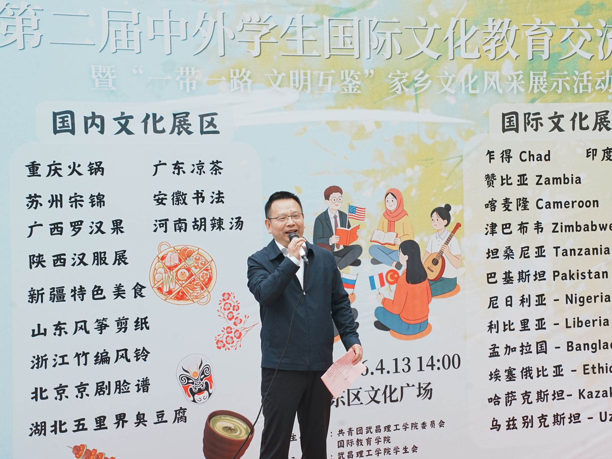 武昌理工学院党委书记高建勋在开幕式上发表热情洋溢的致辞。他指出,“一带一路”是携手前进的阳光大道,更是各国青年相知相交、共同进步的广阔舞台。本届活动规模更盛、内容更丰,国内13个特色展区荟萃河南胡辣汤、江苏宋锦等华夏风物,国际13国风情展台展现丝路沿线国家的民俗魅力,中西文明成果在此握手,古今丝路风采在此交汇,正是学校国际化办学成果的生动体现与“和而不同”精神的精彩诠释。