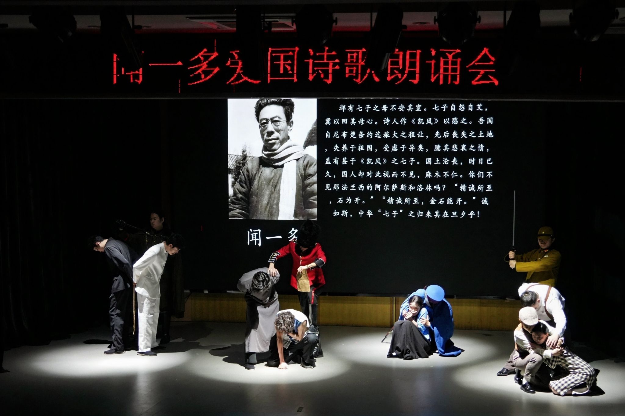 整场朗诵会共演绎了15个节目,包括诗朗诵、情景朗诵、歌伴舞等。展演作品既有闻一多的《红烛》《七子之歌》《醒呀!》《我是中国人》等代表作,也有后人为缅怀其而作的《说与做——闻一多雕像前的沉思》《永不熄灭的红烛》等作品。