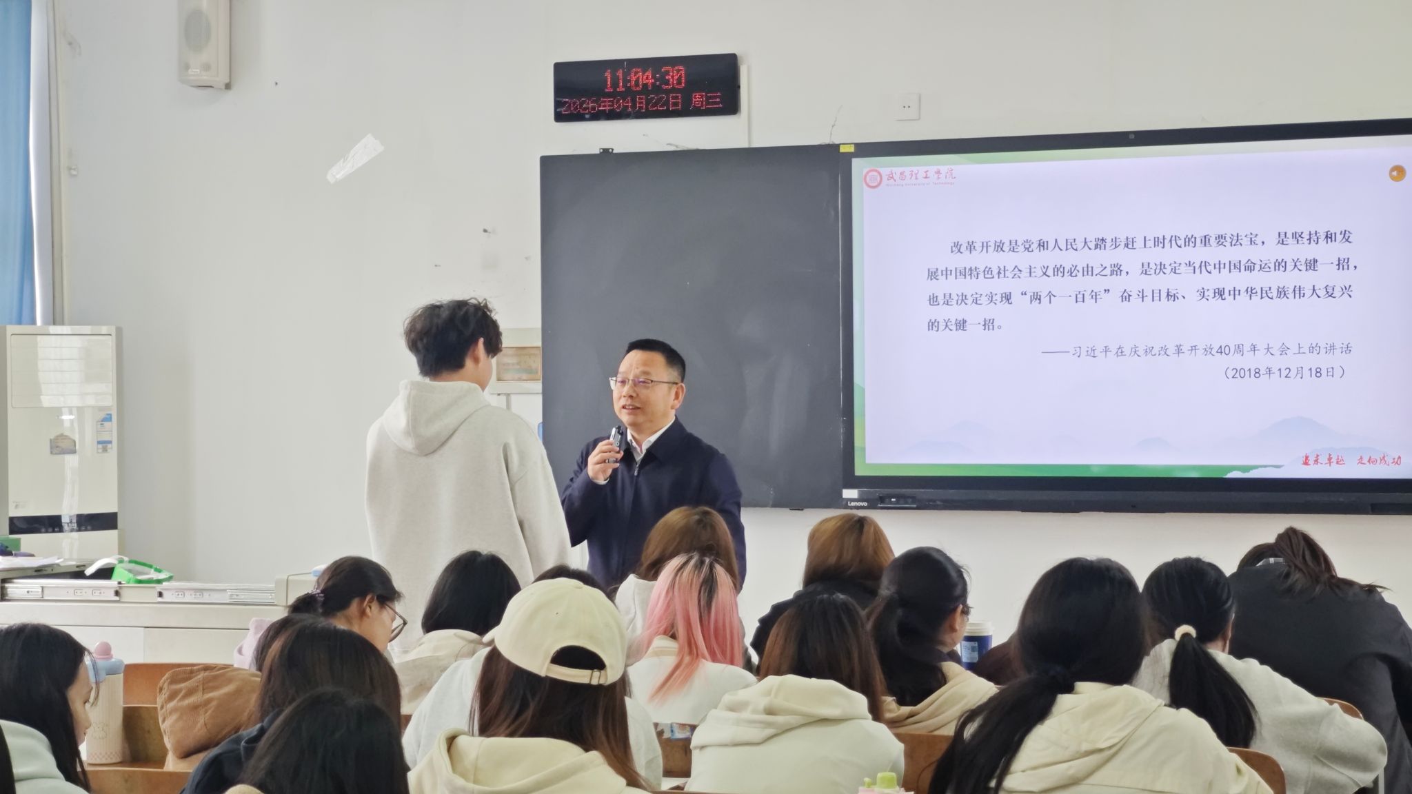 中南在线4月23日消息(记者 祝琳 特约通讯员 曾晓辉 报道)2026年4月22日上午,武昌理工学院空间信息工程学院506教室里,一堂别开生面的思政课火热开讲。武昌理工学院党委书记高建勋走进课堂,与马克思主义学院青年教师程雪同台接力授课,围绕“改革创新与青春成长”主题,与药学2501班、康复治疗学2501班青年学子面对面交流,将创新的种子播撒进学子心田,用一堂有深度、有温度、有力度的思政大课,为青年成长成才指明方向。马克思主义学院副院长曾晓辉陪同听课。