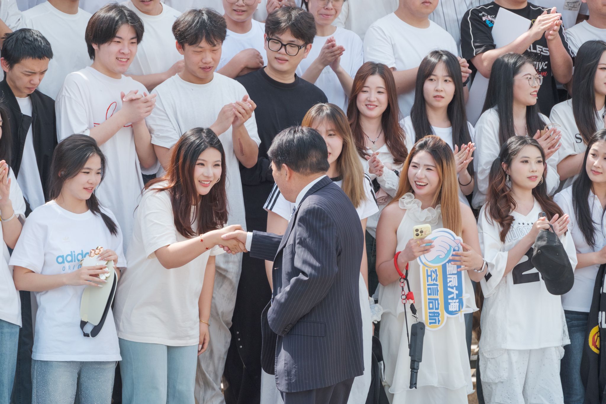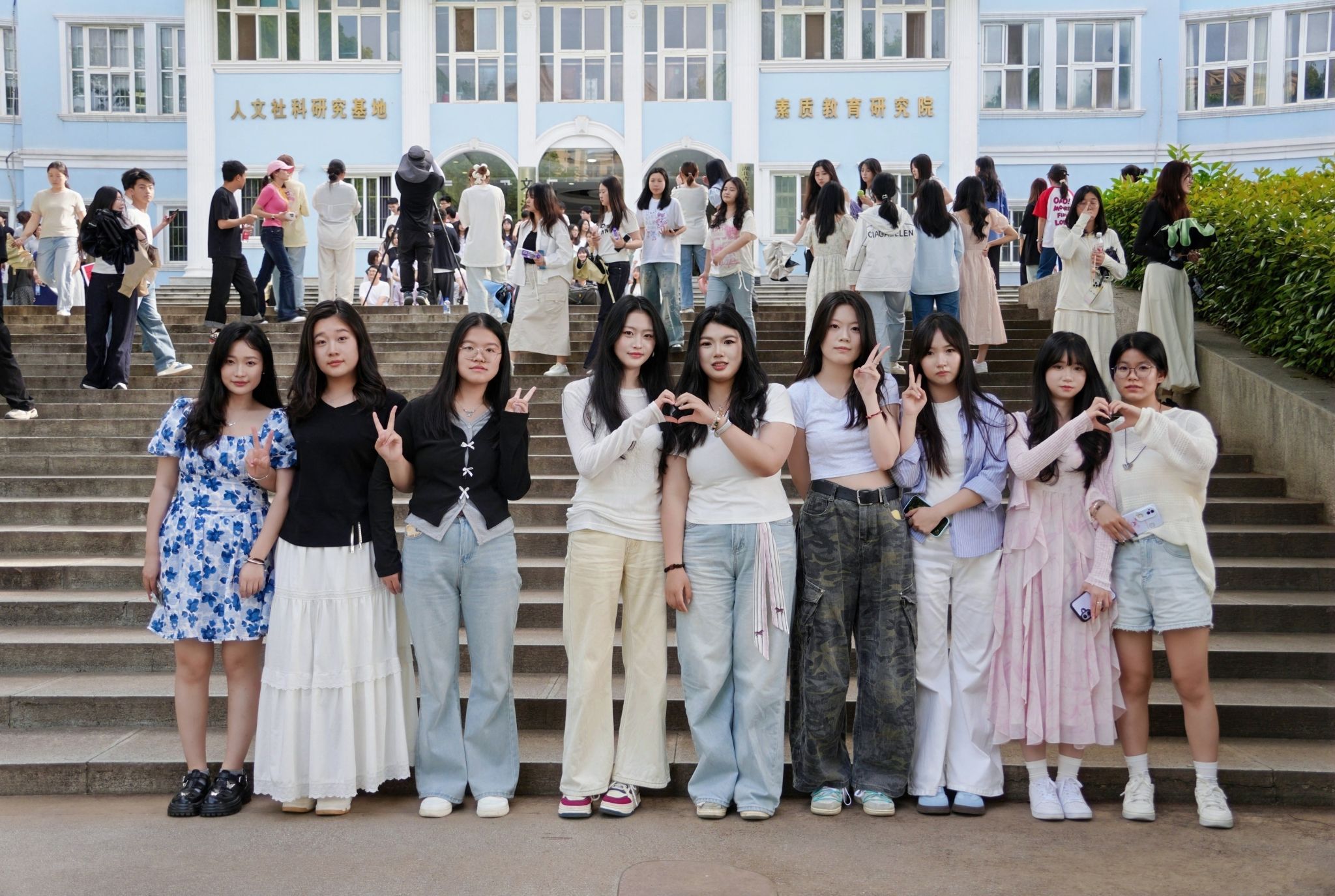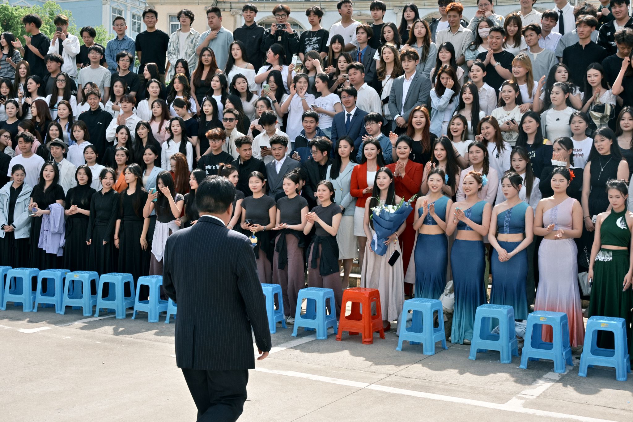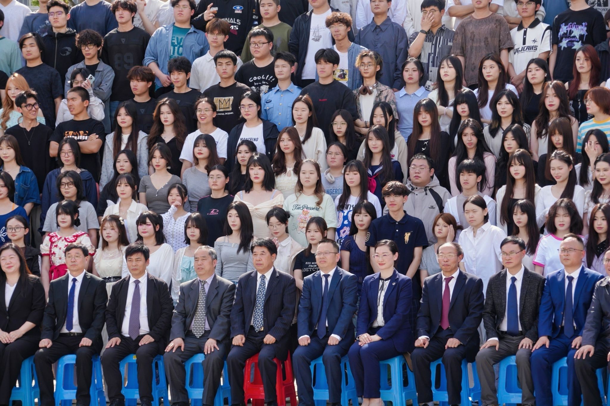 拍摄现场氛围热烈而温馨,学子们的穿搭各具特色:简约白T清爽吸睛,满是少年感;利落西装气场全开,提前解锁“职场人”模样;特色民族服饰色彩亮眼,藏着独有的文化韵味;连衣裙仙气飘飘,尽显青春活力。大家有序列队、比剪刀手、并肩说笑,在镜头前留下了属于自己、班级与学院的青春印记。