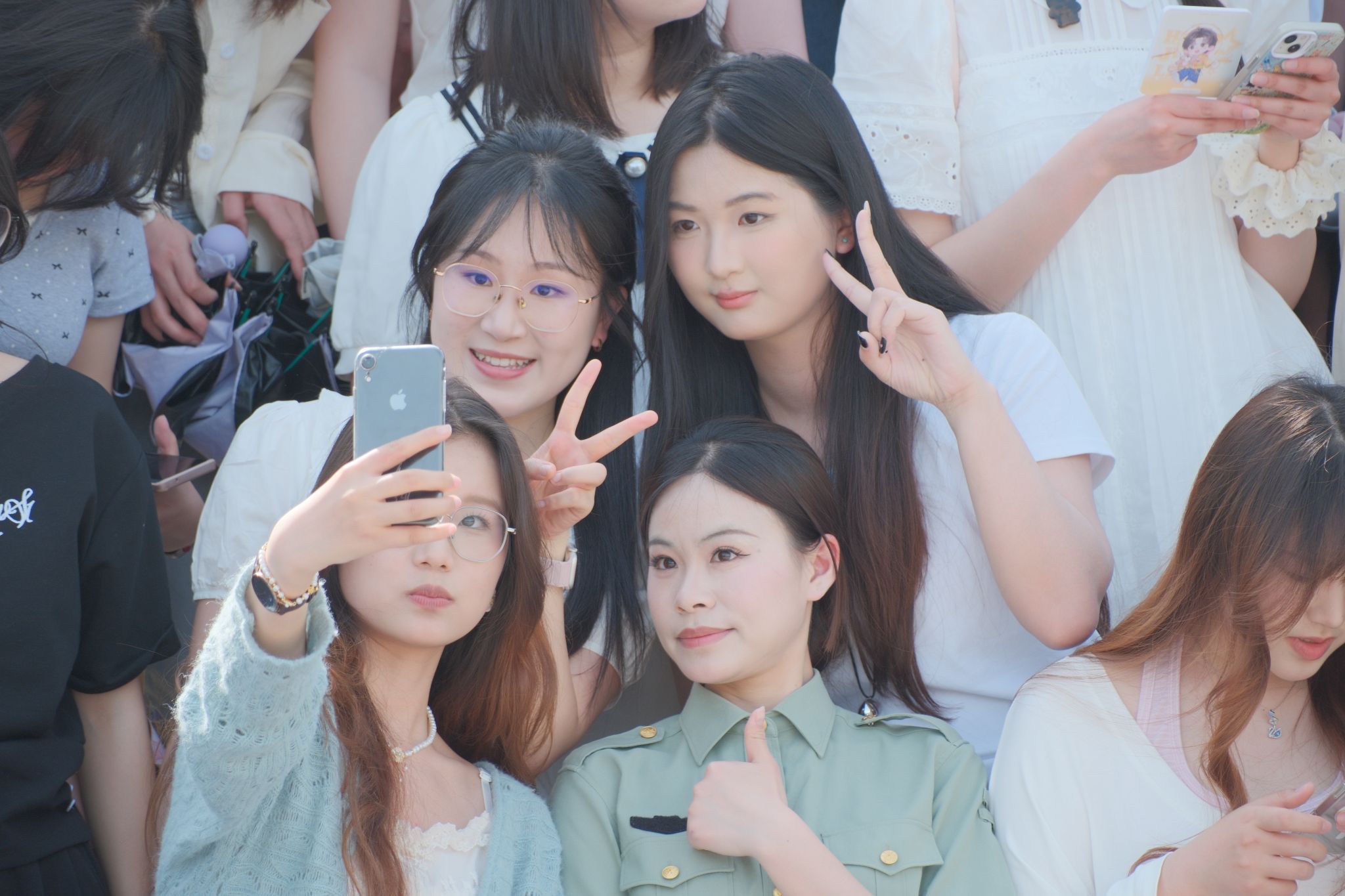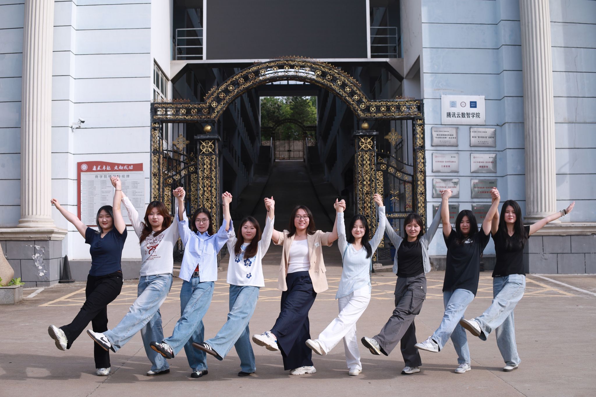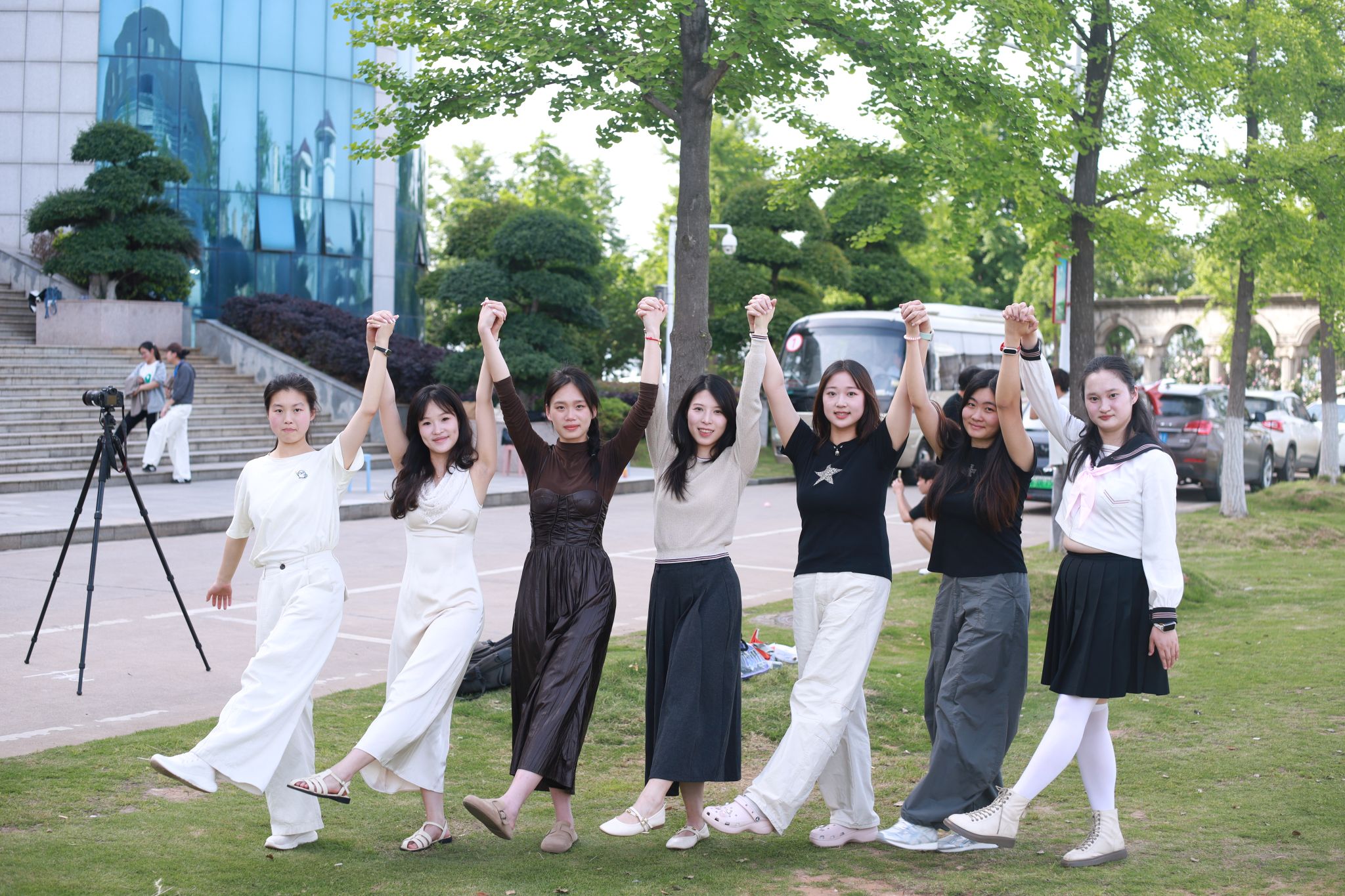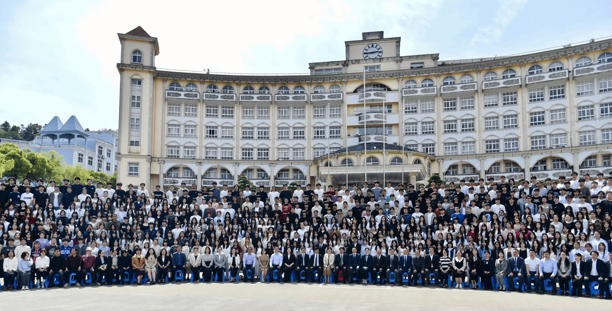 拍摄现场氛围热烈而温馨,学子们的穿搭各具特色:简约白T清爽吸睛,满是少年感;利落西装气场全开,提前解锁“职场人”模样;特色民族服饰色彩亮眼,藏着独有的文化韵味;连衣裙仙气飘飘,尽显青春活力。大家有序列队、比剪刀手、并肩说笑,在镜头前留下了属于自己、班级与学院的青春印记。