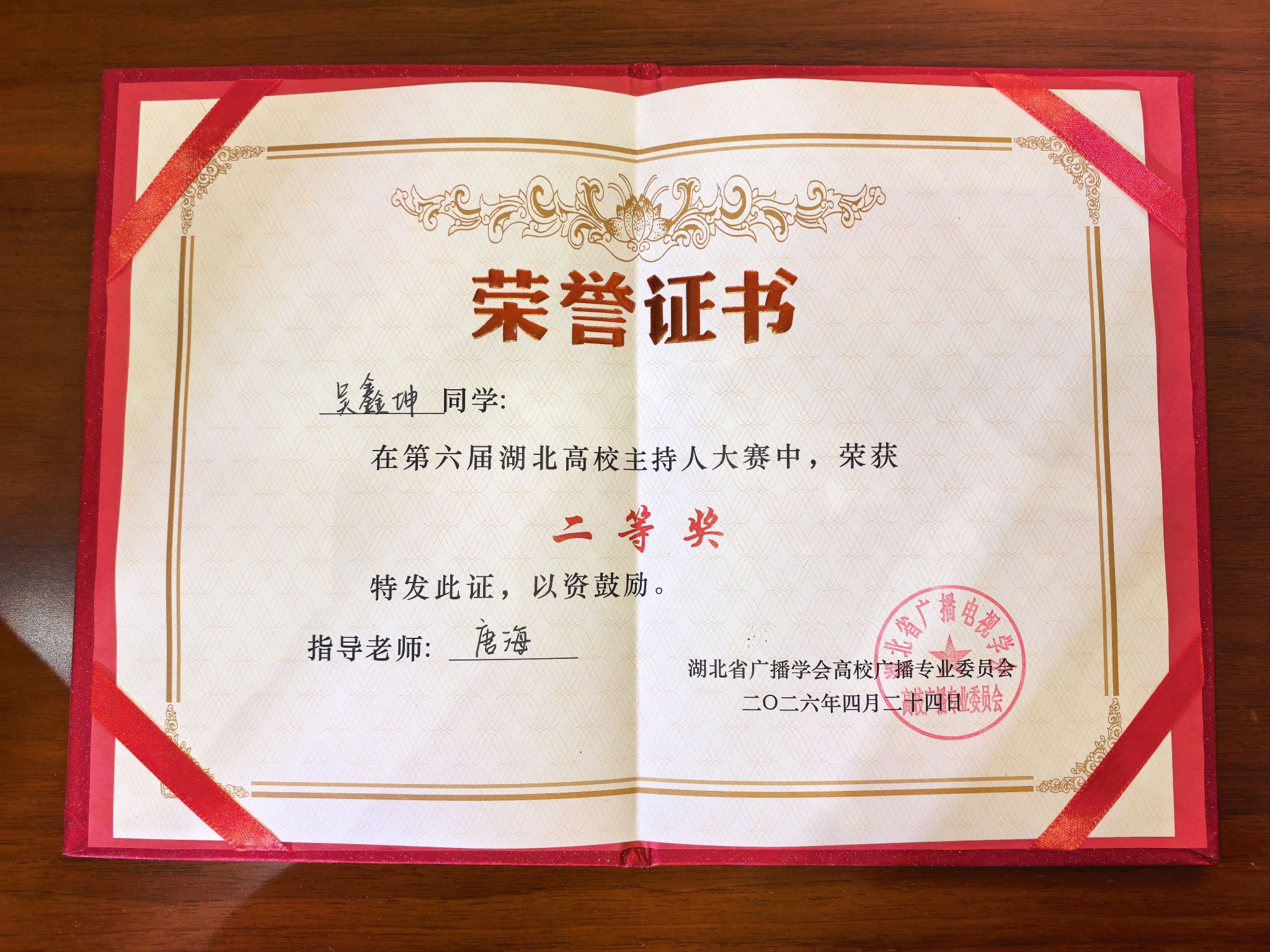 赛后,吴鑫坤分享了自己的参赛感悟。他感谢大赛主办方与学校提供的优质展示平台,表示这份二等奖既是对他热爱主持的肯定,也让他清晰认识到自身不足,为后续成长指明了方向。“感谢各位领导和老师一直以来的支持与悉心指导,让我能够代表武昌理工学院站在这个舞台上。未来我会继续打磨专业技能,用声音传递更多温暖与力量,传递校园正能量!”