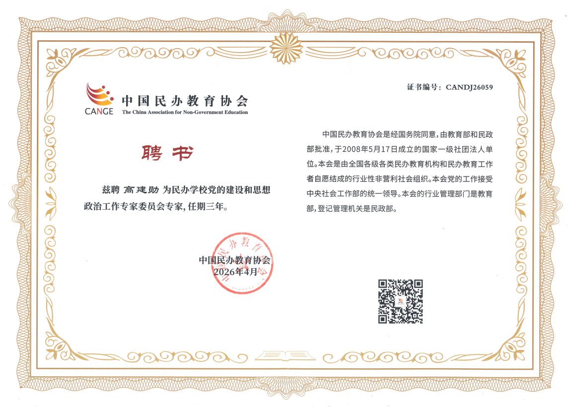 本次会议由中国民办教育协会、教育部民办高校思想政治理论课分教指委主办,旨在深入学习习近平总书记关于民办学校党的建设重要指示精神,落实教育强国建设战略部署,以高质量党建促进民办教育高质量发展。中共中央宣传部原副部长王世明、中国民办教育协会会长刘林、教育部思想政治工作司余先亭副司长作了讲话。会议宣布成立民办学校党的建设和思想政治工作专家委员会,专家委员会由国内名校党建、思政专家组成,高建勋被聘为专家委员会专家,任期三年。