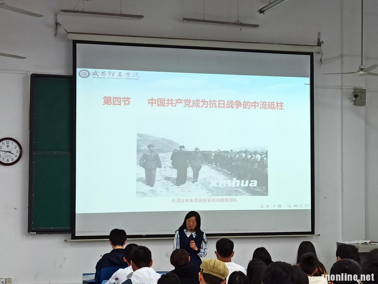 张翠萍老师首先通过课前提问带领学生回顾上次课的教学内容,引导学生进入学习状态。复习提问结束后,张老师开门见山引入本次课的主题——《中国共产党成为抗日战争的中流砥柱》,通过解释“中流砥柱”的含义,并以习近平总书记在纪念中国人民抗日战争暨世界反法西斯战争胜利75周年座谈会上的讲话引入本次课的教学内容,从六个方面讲解中国共产党为什么能够成为抗日战争的中流砥柱。在讲课过程中,张老师播放视频带领学生回顾那段艰苦卓绝的抗战历史,讲述一个个具体而真实的抗战故事引导学生认识中国共产党为抗日战争所作的巨大牺牲,设置问题讨论帮助学生辨析错误的历史观,树立马克思主义唯物史观。