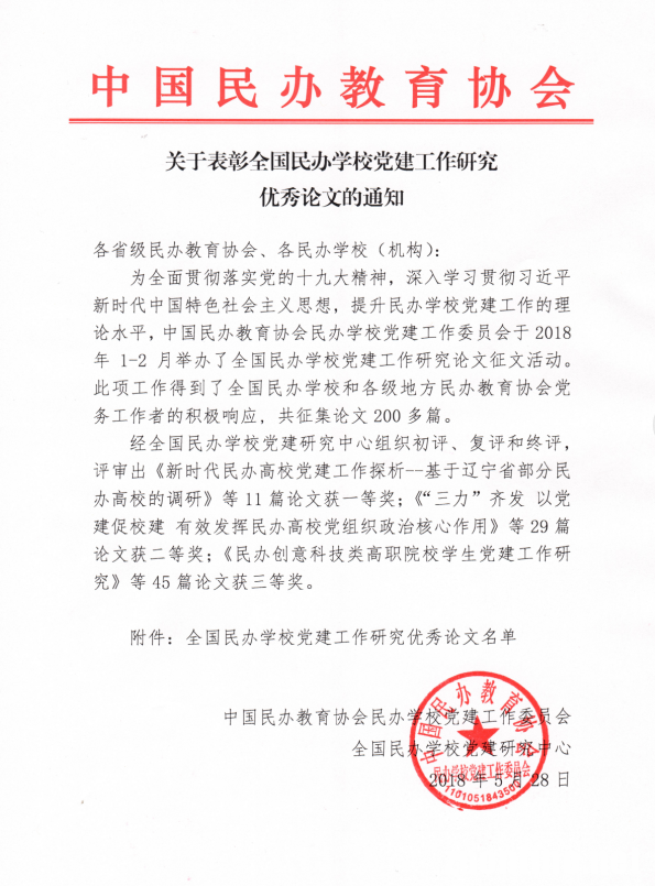 据了解,为全面贯彻落实党的十九大精神,深入学习贯彻习近平新时代中国特色社会主义思想,提升民办学校党建工作的理论水平,中国民办教育协会民办学校党建工作委员会于2018年1-2月举办了全国民办学校党建工作研究论文征文活动。吸引了全国民办学校和各级地方民办教育协会党务工作者的积极参与,共征集论文200多篇。通过组织初评、复评和终评,最终评审出一等奖论文11篇,二等奖论文29篇,三等奖论文45篇。武昌理工学院王海涛副教授的论文《素质导师制:发展素质教育背景下大学育人制度创新》从新时代对高素质人才的新要求出发,指出目前时代下素质导师制创建必然性,有利于优化大学生素质结构、弥补大学素质教育制度缺陷等,把素质导师从“管琐事”中解放出来,变“管”为“导”,致力于对学生“六导”,成为培养学生综合素质的“导师”,详细的阐述了对于大学在发展素质教育背景下高校育人模式的一大创新要求。
