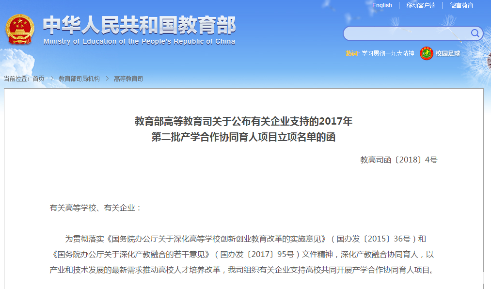 为贯彻落实《国务院办公厅关于深化高等学校创新创业教育改革的实施意见》(国办发〔2015〕36号)和《国务院办公厅关于深化产教融合的若干意见》(国办发〔2017〕95号)文件精神,深化产教融合协同育人,以产业和技术发展的最新需求推动高校人才培养改革,教育部高等教育司组织有关企业支持高校共同开展产学合作协同育人项目。