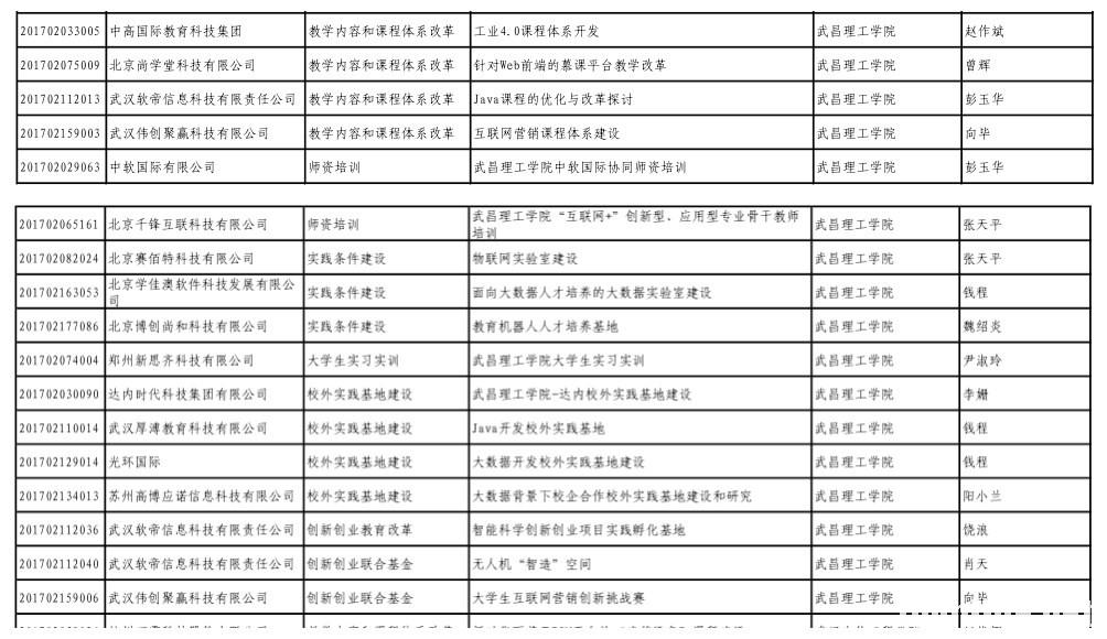 根据《教育部高等教育司关于公布有关企业支持的产学合作协同育人项目申报指南(2017年第二批)的函》(教高司函〔2017〕47号)要求,武昌理工学院积极组织师生向企业提交了项目申请,经过系列评选,最终17个项目获批立项。据了解,在教育部高等教育司公布的有关企业支持的2017年第一批产学合作协同育人项目立项名单中,武昌理工学院获批15项,获批数量位居全国高校前列,在湖北省域高校中,按获批教师数位居第二位,按获批项目数位居第四位。