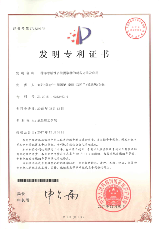 《一种洋葱活性多肽提取物的制备方法及应用》获"国家发明专利"