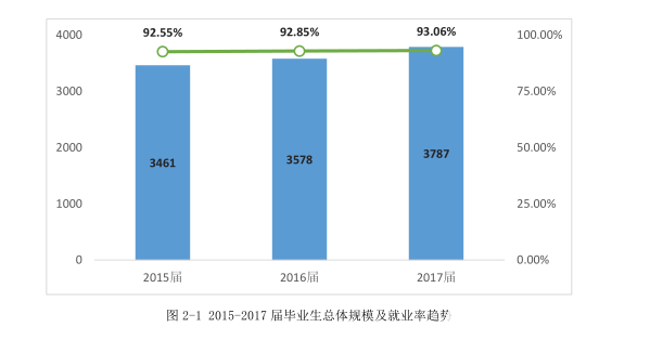 据了解,该校 2017 届毕业生共 3787 人,截止 2017 年 8 月 31 日,有 3524 人已就业,就业率为 93.06%。其中本科毕业生共 3040 人,就业率为 94.08%;专科毕业生共747 人,就业率为 88.89%。学校2015-2017 届毕业生规模和就业率均呈逐年上涨趋势,其中 2017 届毕业生人数和就业率均创三年新高。整体来看,2017 届毕业生就业率保持在较高水平。调研数据还显示,该校2017 届毕业生对自己就业现状满意度为 86.92%,对母校满意度的 92.85%,对学校教育教学中各项指标的满意度评价均在 84.00%以上。用人单位对该校培养的毕业生质量认可度为 96.43%,整体来看,毕业生和用人单位对学校的教育教学和就业创业服务工作认可度较高。