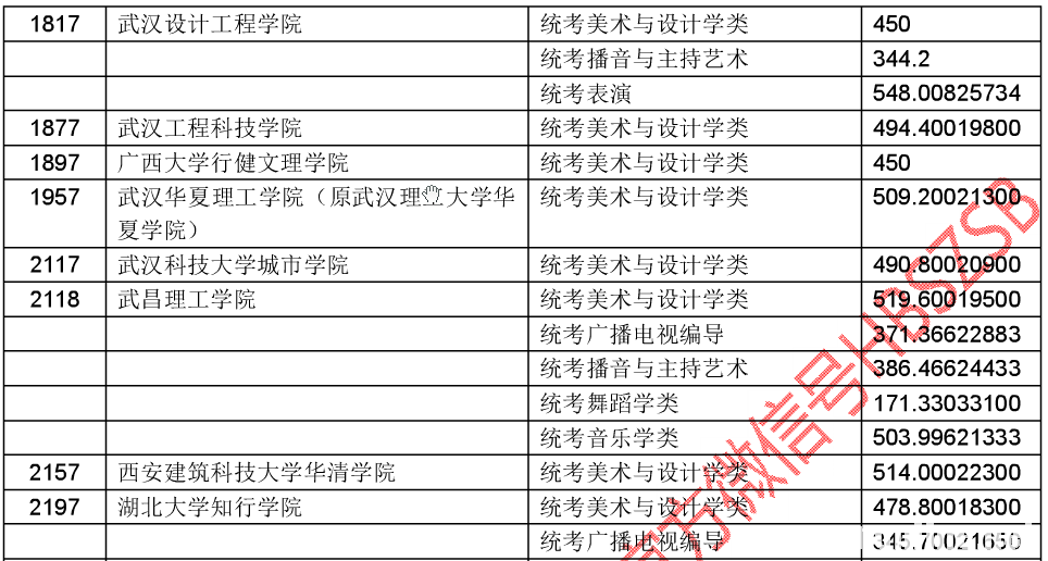 湖北省2016年普通高考招生艺术本科(二)录取院校平行志愿投档线