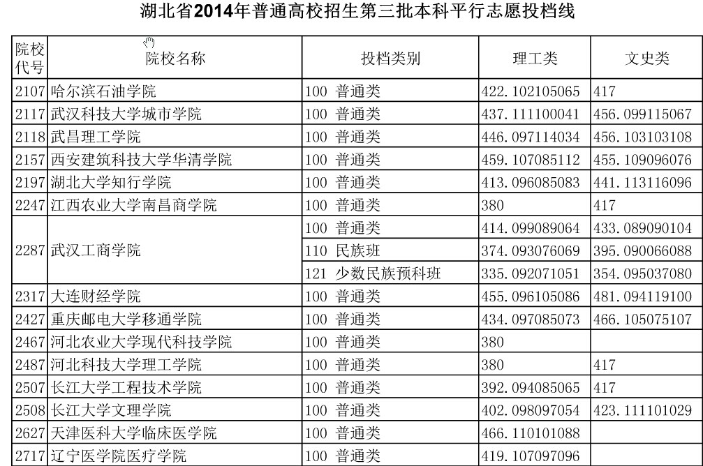 湖北省2014年普通高校招生第三批本科平行志愿投档线