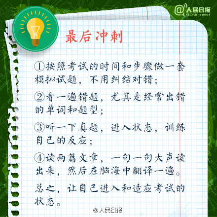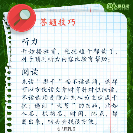 附【过来人提醒的答题技巧】①听力:播放前,先读选项,对于预判听力内容有帮助;②阅读:先读“题干”,读文章时更有针对性,不读选项,防止先入为主;③遇到“大写”,如人名、机构名、时间、地点,圈出来,便于回头查找;④翻译:别因追求“达”或“雅”而浪费时间,做到“信”就行。