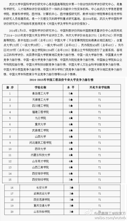 中南在线4月18日消息(通讯员 秦芳 报道)武昌理工学院城市建设学院工程造价专业在全国71所开设此专业的高校中脱颖而出,在2014—2015工程造价专业大学竞争力排行榜中位居第七。
