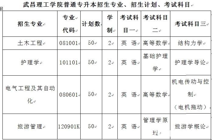 中南在线4月25日消息(记者 鲁信 报道)日前,武昌理工学院发布2014年普通专升本招生简章,面向湖北省普通高等教育专科层次的应届毕业生招生共计200人。今年是该校具有招收“专升本”资格后首次招生,有4个专业招生,分别是土木工程、护理学、电气工程及其自动化和旅游管理,各计划招生50人。