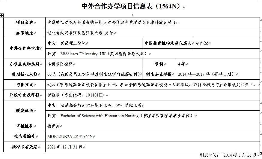 据了解,武昌理工学院与英国密德萨斯大学合作举办护理学专业本科教育项目从2014年开始招生,每年1期,每期60人,学制4年,招生纳入国家普通高等学校教育招生计划,参加全国普通高等学校统一入学考试。毕业后,学生可获得普通高等教育本科毕业证书、学士学位证书和外方护理学荣誉理学学士学位。