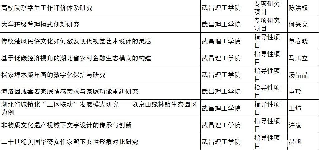 2014年度湖北省教育厅人文社会科学研究项目评审,全省共有986个申报项目获评审通过,其中武昌理工学院有9个项目获批,获批数量位居同类高校前列。
