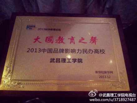 在2013年新华教育论坛——“大国教育之声”活动上,公布了2013中国教育功勋人物、2013中国突出贡献教育人物、2013中国最具综合实力教育集团、2013中国品牌影响力民办高校、2013中国品牌影响力独立学院等20余个奖项。经过网民投票、专家评审等环节,武昌理工学院从400余所民办高校中脱颖而出,成功获评为“2013中国品牌影响力民办高校”,并且全国排名第二。