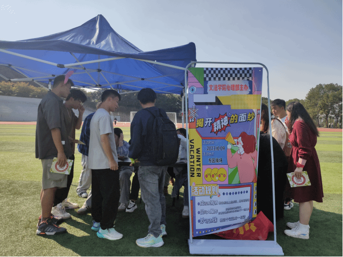 活动当天下午,操场上设立了十个活动区,八个学院心理部、一个心理协会和一个校学生心理部的活动区域,学生在九个关卡处集齐九个徽章就可以到校学生心理部兑换抽取终极大奖的机会。活动现场气氛十分活跃,学生们都围在各学院活动区积极参与小游戏,各个院海报的主题各不相同,呈现出缤彩纷呈的一面。有文法学院的“揭开精神的面纱”,有智能建造学院的“抑制强迫障碍”的小游戏。大家各自组队参加,游戏种类丰富,人工智能学院学院的“心有灵犀”可谓是能考验朋友间的默契度,“你行我不行”可以知道朋友的许多优点。文法学院的“妙语连珠”反映出了学生们天马行空的想象力,生命科学学院的绘画道尽了人间百态,表达了自己在生活所遇到的压力。