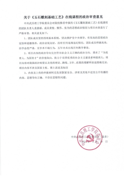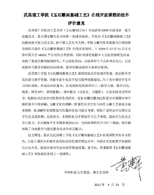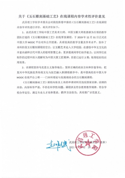 中华文化源远流长、灿烂辉煌。在5000多年文明发展中孕育的中华优秀传统文化,积淀着中华民族最深沉的精神追求,代表着中华民族独特的精神标识,是中华民族生生不息、发展壮大的丰厚滋养,是中国特色社会主义植根的文化沃土,是当代中国发展的突出优势,对延续和发展中华文明、促进人类文明进步,发挥着重要作用。《玉石雕刻基础工艺》课程旨在让中华优秀传统玉雕文化与技艺走入大学校园,推动现代学生对中华优秀传统文化的传承与创新发展,展现文化自信,培养学生中华优秀传统文化的凝聚力、影响力、创造力与大国工匠精神。中国大学MOOC《玉石雕刻基础工艺》2023年由教育部获批为第二批国家级一流本科课程。