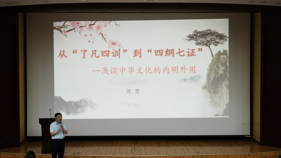 在强调“孝”作为中华优秀传统文化的重要组成部分时,周勇老师向现场观众推荐了《孝经》、《论语》等国学经典,并以即将到来的父亲节和刚过去的母亲节为背景,用乌鸦反哺的典故,呼吁师生心怀感恩。周勇老师还提出了天人合一思想,这一理念为中国提供了人与自然和谐共处的哲学视角,包括整体观、和谐观、生态观和进取观。