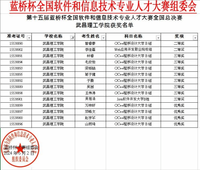 中南在线6月6日消息(大通社记者 岳佳佳 报道)近日,由工业和信息化部人才交流中心主办的第十五届蓝桥杯全国软件和信息技术专业人才大赛全国总决赛成绩揭晓,武昌理工学院人工智能学院学子在全国总决赛荣获国家二等奖2项、国家三等奖8项以及优秀奖4项,获奖数量在全省民办高校中荣登榜首!