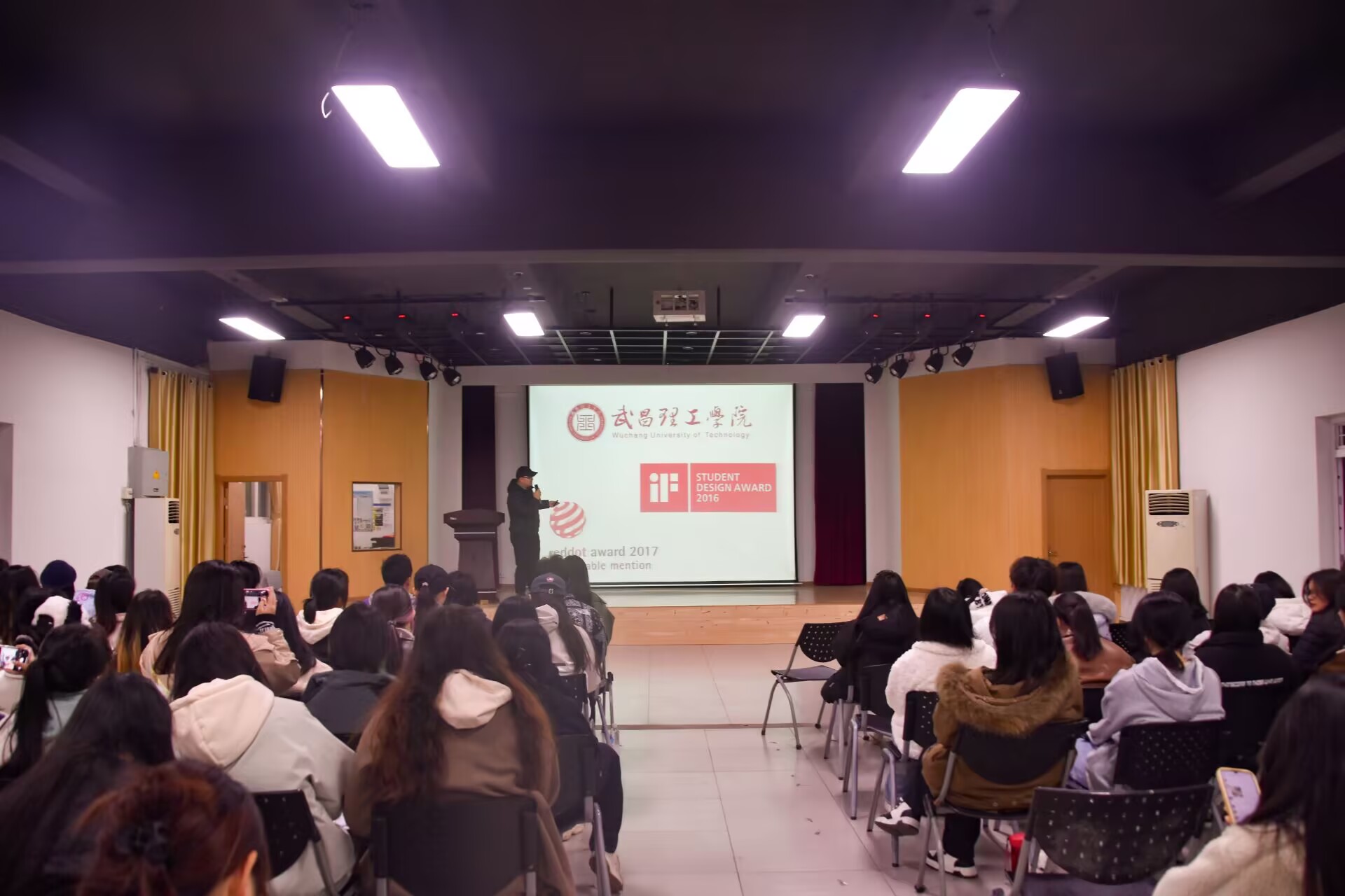 讲座接近尾声,熊伟教授也为同学们作出总结,勉励武昌理工学院艺术设计学院的学子们能在各式比赛和生活学习中,确立自己的目标,善于发现细小的事物,肯思考,肯行动。不管多么好的创意,都要付诸行动。希望同学们借国际设计竞赛舞台来提升能力和展现风采,此次讲座为校园吹来“创新设计之风”,点燃了更多学生对于艺术设计的参与热忱,助力着每一个在设计赛道蓄势待发、逐梦前行的人。