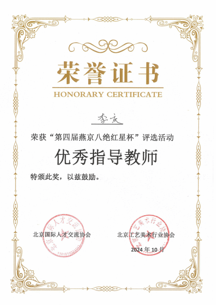 指导教师李庆、张为、黄宇三位老师凭借出色的指导能力,荣获优秀指导教师奖。三位老师在活动中也纷纷表示,能够指导学生获得如此佳绩,是团队共同努力的结果。他们强调,在教学中不仅要注重技艺的传授,更要重视学生创新能力和实践能力的培养。未来,武昌理工学院工艺美术系将继续致力于工艺美术教育,培养更多优秀人才,为传承和发展中国传统工艺做出贡献。