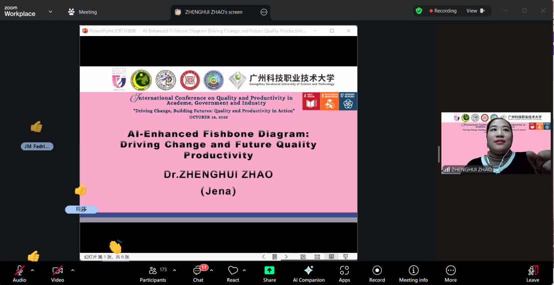 会上,菲律宾中央大学研究生学院院长DR. FRANCIS MICHAEL YAMBAO教授,菲律宾中央大学国际学术事务副校长DR. MARIA FLORDELIZA ANASTACIO 教授,菲律宾巴马穆尔地区旅游局局长MARITES MANGUINDRA教授等分别进行了主旨发言。在主题演讲环节,商学院教师赵政慧博⼠发表了题为“AI-Enhanced Fishbone Diagram: Driving Change and Future Quality Productivity”的学术报告,系统阐述了⼈⼯智能技术与传统⻥⻣图分析法的创新性结合。报告提出四⼤技术突破⽅向:⾃动化因素提取实现数据处理效率提升300%、动态更新机制满⾜实时质量监控需求、因果推理算法优化问题优先级排序、知识图谱整合构建跨领域质量分析模型。这些创新点有效解决了传统质量管理⼯具在⼤数据时代⾯临的数据过载、分析滞后等痛点问题,获得了国际学术事务副校长: DR. MARIA FLORDELIZA ANASTACIO教授及菲律宾质量协会等专业机构代表的⾼度评价。