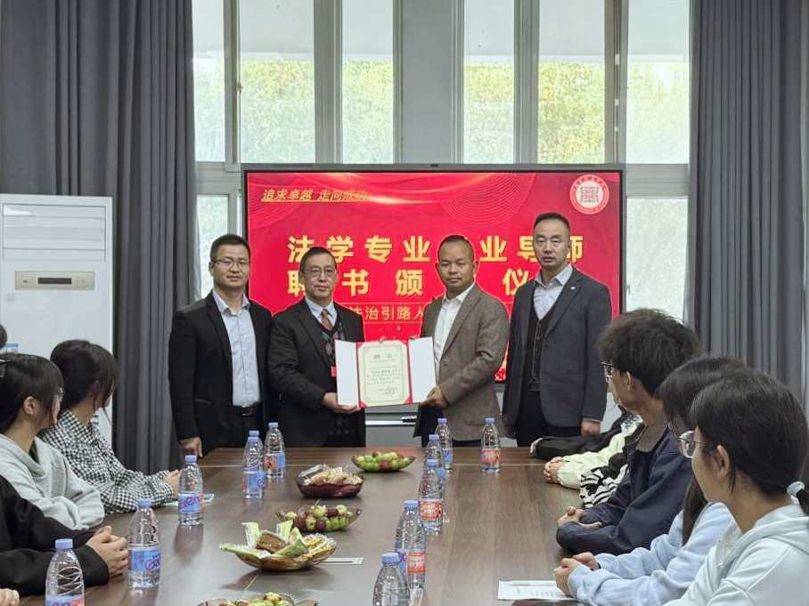 文法学院院长胡德才、党总支书记南小烈、教学副院长陶新荣为杨照勇校友颁发了“法学专业行业导师”聘书。杨照勇接过聘书,深情回顾在校求学时光,感慨学院发展日新月异,并表示将不负母校重托,以实务经验反哺教学,助力青年学子成长成才。随后,他结合自身执业经历,就法律职业伦理、基层司法实践及企业法律顾问工作等话题与师生深入交流,现场气氛热烈而真挚。