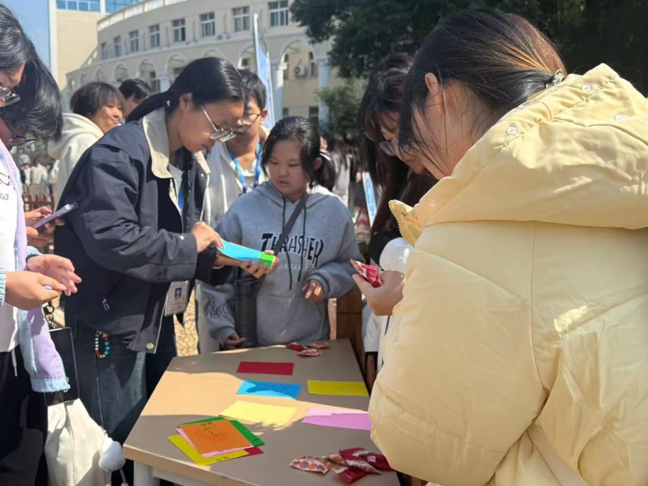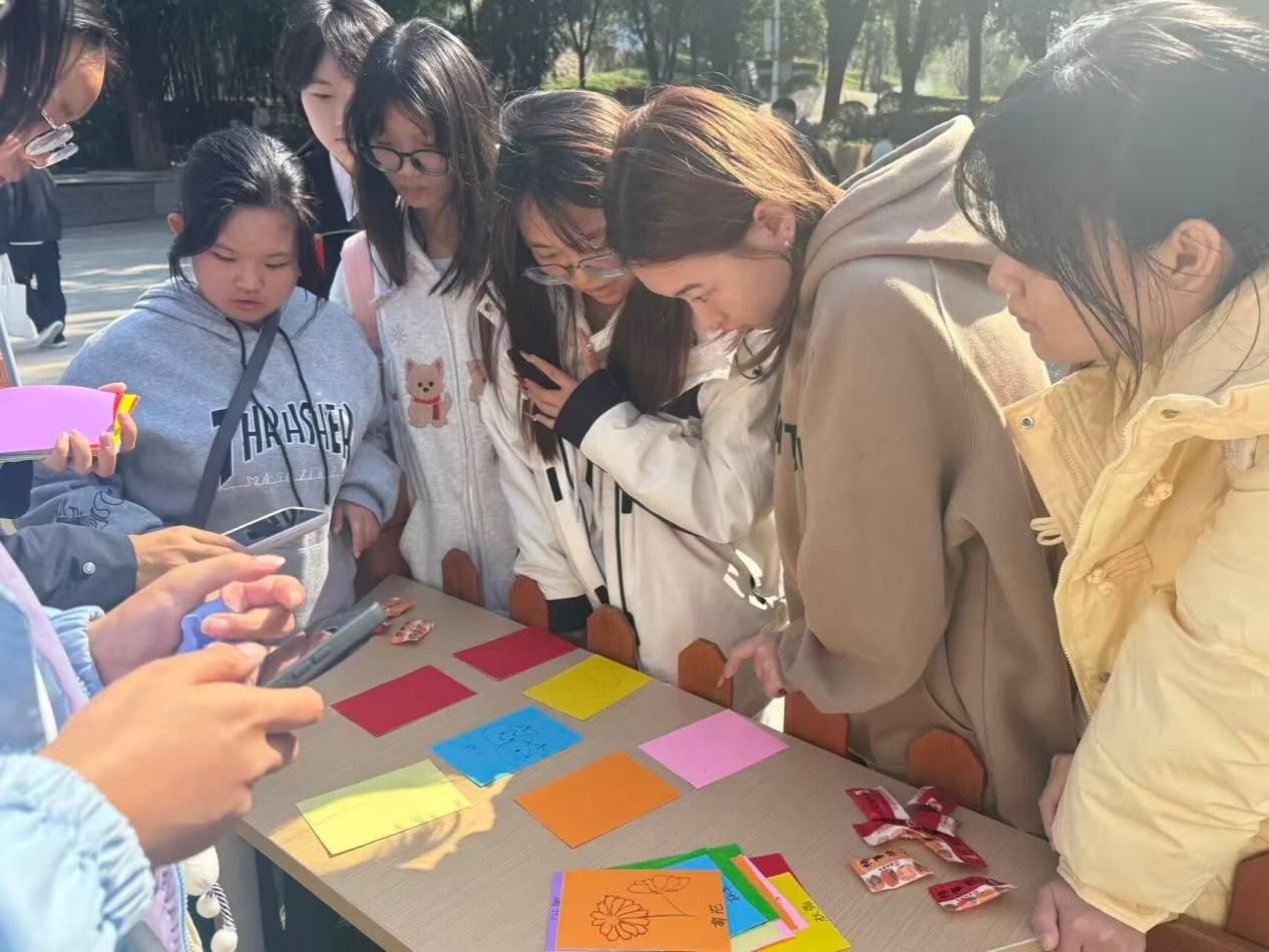 最添温情的当属“书写祝福卡”环节。一张张色彩鲜艳的卡片前,学生们或低头沉思,或认真书写。有同学向远方家人倾诉“在学校一切都好,你们注意添衣”的牵挂。有学长为刚入学的学弟学妹写下“愿你在校园找到热爱,勇敢前行”的鼓励;还有同学留下“霜降虽凉,愿你被世界温柔以待”的暖心寄语。写完的祝福卡被一一悬挂在棚下的棉绳上,风一吹,五颜六色的卡片轻轻晃动,字里行间的真诚与善意,成为活动现场最动人的风景。