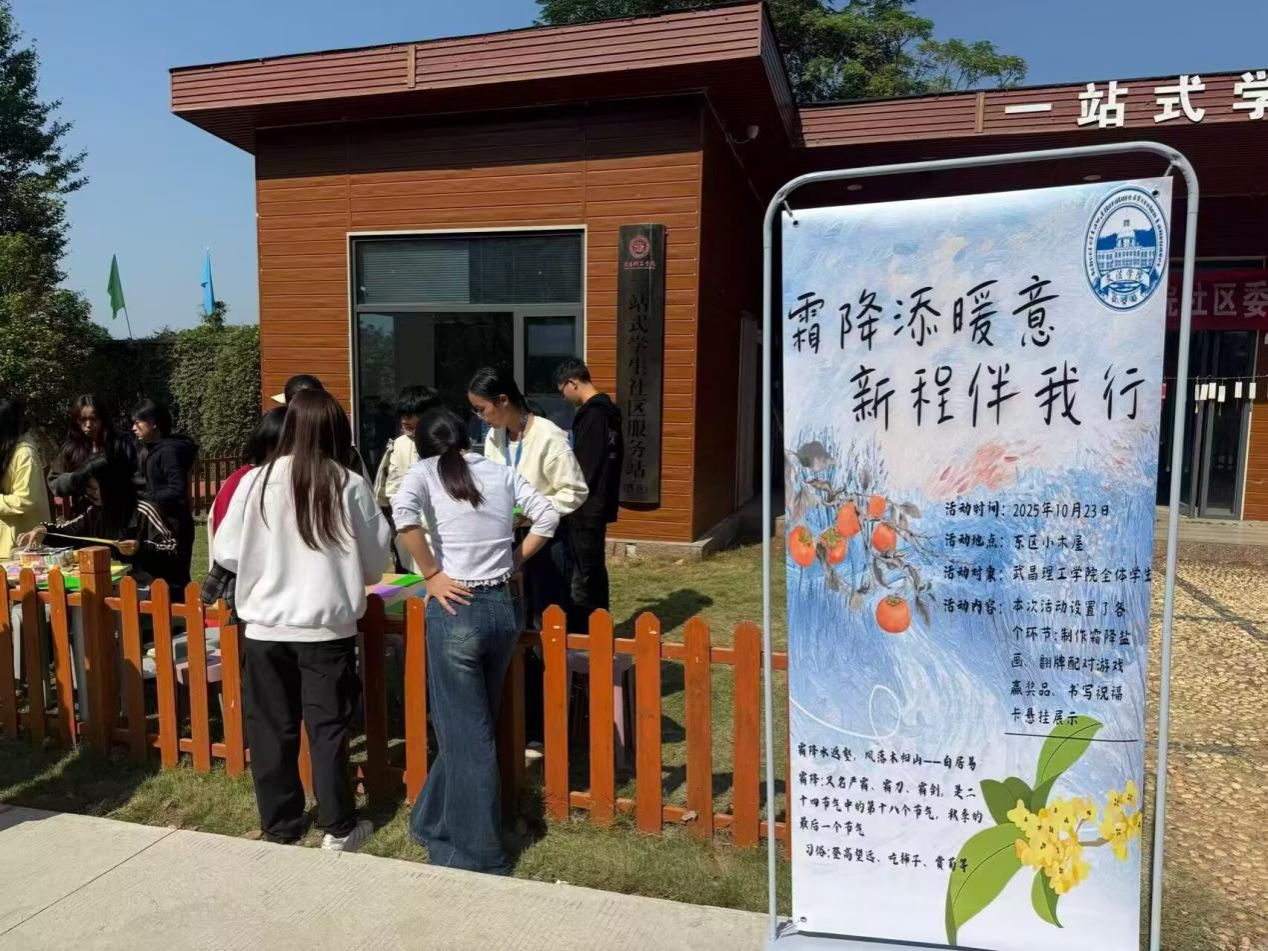 中南在线10月24日消息(大通社记者 马思琪 报道)10月23日,武昌理工学院文法学院社区委在西区小木屋开展“霜降添暖意,新程伴我行”主题活动。本次活动旨在为让中华传统节气文化“活”起来,帮助新生快速融入校园大家庭,同时为高年级学生舒缓学业压力,有趣的环节设计与温馨的互动氛围,吸引了全校各年级学生踊跃参与。