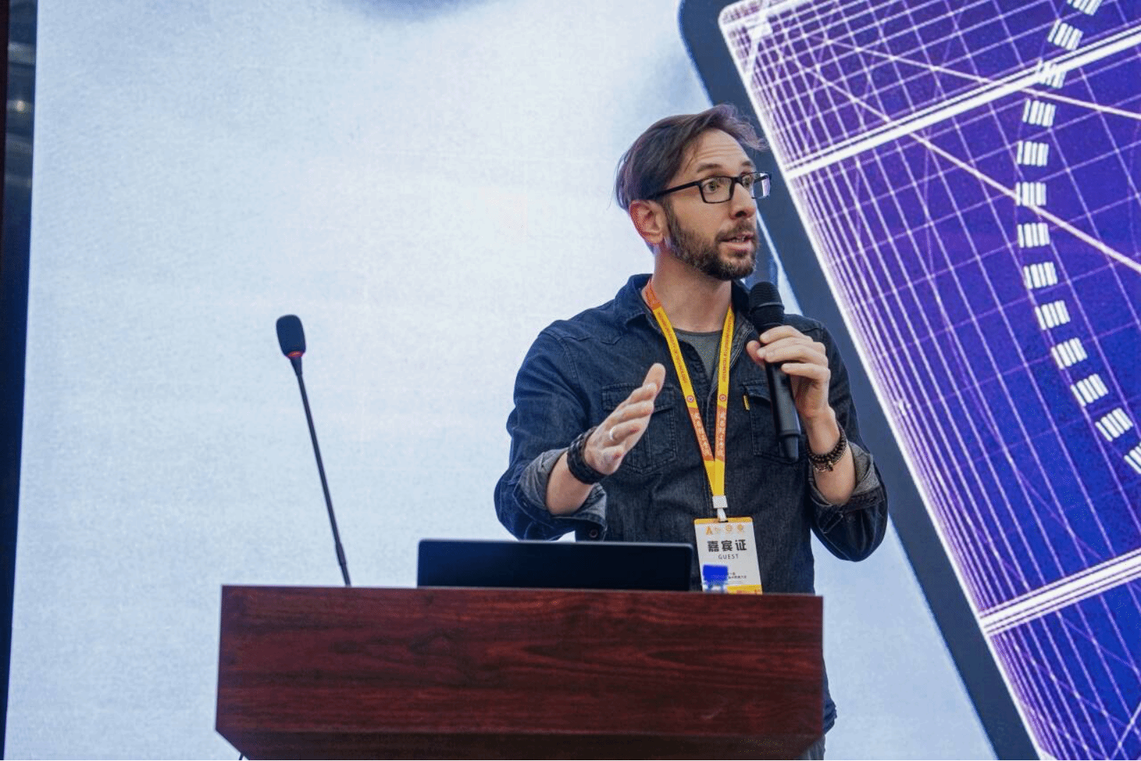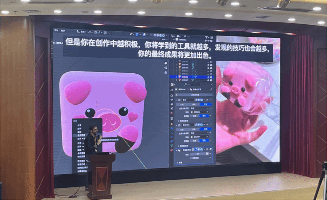 美国威斯康星大学密尔沃基分校教授Bit Shape Software创始人兼开发者Kevin Schlei接力演讲。在英文翻译的协助下,Kevin Schlei清晰梳理了从早期硬件音序器到现代数字音序器的发展轨迹,随后,他聚焦现代技术对音序器的革新,结合自主研发的软件成果,展示了他团队开发的音序器不仅实现了多轨音频的精准同步,更嵌入了AI辅助的旋律生成模块,让创作者能在技术工具的支持下,更自由地探索声音艺术的可能性。演讲中,Kevin Schlei特别强调“解决问题中的创作乐趣”,他以现场演示的3D建模与声音联动案例,引发在场师生对“技术工具与艺术表达共生关系”的深度思考。