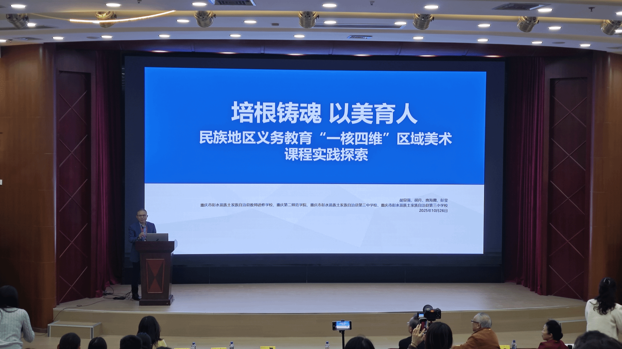 如何将独特的地域文化资源转化为美育优势,是分会场的另一大亮点。重庆市彭水苗族土家族自治县的胡显强老师分享《培根铸魂·以美育人:民族地区学校“一核四维”美术课程30年实践探索》,系统介绍了长达三十年的本土化课程探索,为民族地区的美术教育提供了可资借鉴的范本。与此同时,人工智能与教学的融合成为热议焦点。上海外国语大学秀洲外国语学校的孟玲娣老师在《以“精”得“境”:非遗农民画的智能新生创作教学》中,探讨了如何借助智能工具为传统非遗注入新的生命力。昭通市北闸中学的田娜老师则直接以《AI赋能的“四位一体”高中美术结构化教学新范式探索》为题,展示了技术驱动下教学模式的结构性变革。