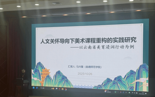 大会集结了国内美术教育界的学术领袖与实践先锋。曲靖师范学院美术学院副院马兴隆以《人文关怀导向下美术课程重构的实践研究——以云南省美育浸润行动为例》为题,其研究结合云南地域文化,锚定教育部“学校美育浸润行动”的核心目标,既推动“双减”政策落地,又为欠发达地区美育资源的活化与课程体系的创新提供了可复制的实践范式。