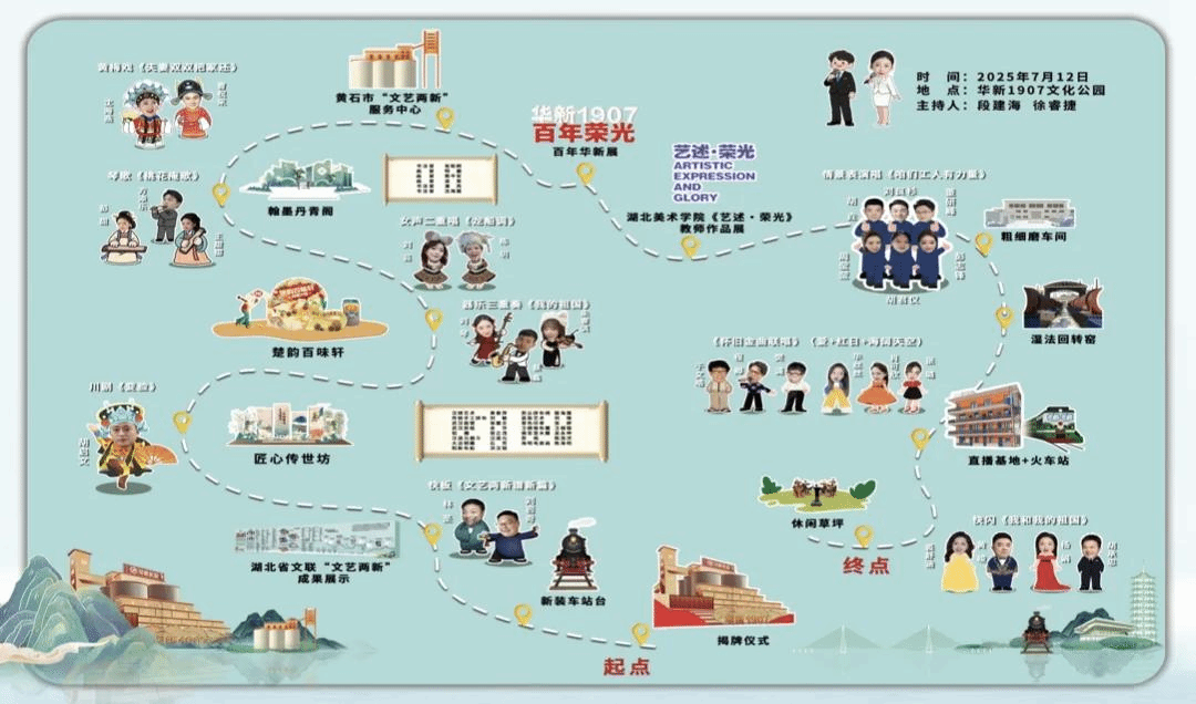 7月12日,“文艺绽芳华,两新谱新篇”演出在华新1907文化公园2.5公里环形动线,串联六大主题舞台,覆盖园区核心区域(文博区、文创区、文商区),用文艺结合工业建筑特色设计差异化场景,将2.5公里工业动线转化为艺术走廊,让观众在行走中感受“文艺两新”的创造力与工业遗产的生命力,实现“一步一景、一步一新”的独特体验。武昌理工学院的刘芸老师和湖北歌手陈玥在此次活动中演唱了湖北民歌《龙船调》。