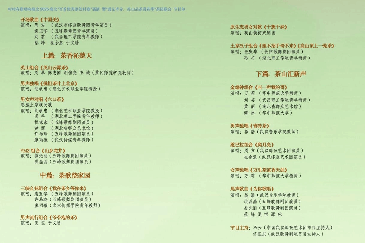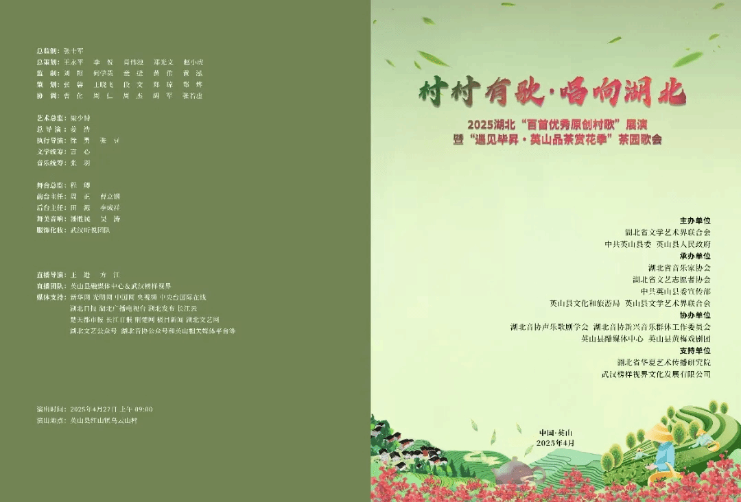 4月27日上午,“村村有歌·唱响湖北——2025湖北‘百首优秀原创村歌’展演暨‘遇见毕昇·英山品茶赏花季’茶园歌会”在湖北省黄冈市英山县红山镇乌云山村盛大举行。湖北省文联党组书记、常务副主席张士军,省文联党组成员、副主席王永平,省音协驻会副主席刘翔等领导出席活动,与英山父老乡亲及来自全省的艺术家们一同沉浸在这场乡村音乐盛宴中。