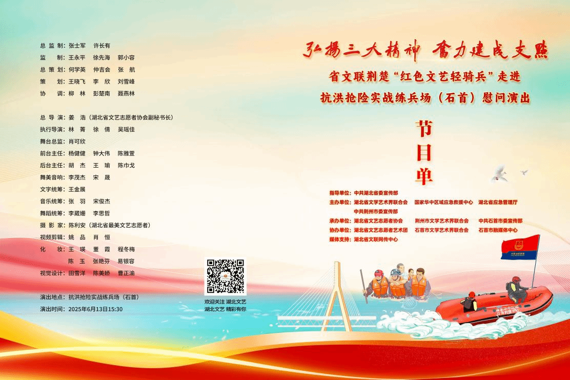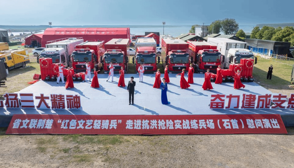6月13日,“弘扬三大精神 奋力建成支点”湖北省文联荆楚“红色文艺轻骑兵”走进抗洪抢险实战练兵场(石首),为奋战在演练一线的指战员献上了一场鼓舞斗志、凝聚人心的艺术盛宴。湖北省文联党组成员、副主席王永平,国家华中区域应急救援中心党委副书记徐先海等领导与现场900余名指战员、地方联勤保障力量、驻地群众及百万网友共襄盛举。武昌理工学院的刘芸老师在此次活动演唱了《中国美》、《南泥湾》和《八月桂花遍地开》三首经典红色歌曲,以精湛的艺术表现力和深厚的文化底蕴,为基层群众带去了一场场震撼心灵的文艺盛宴。