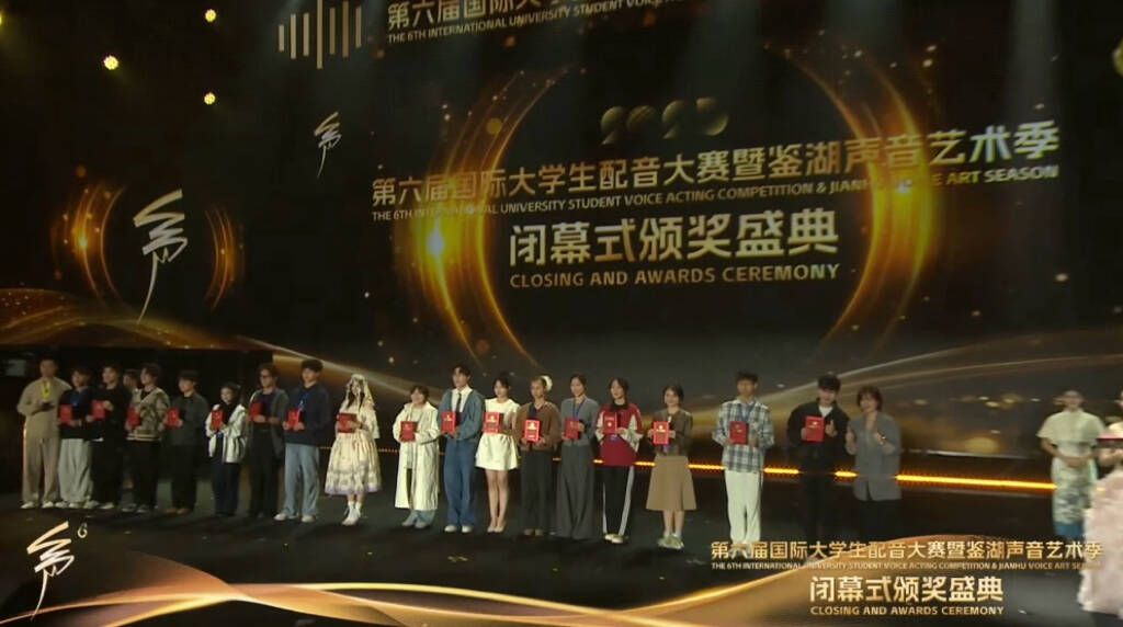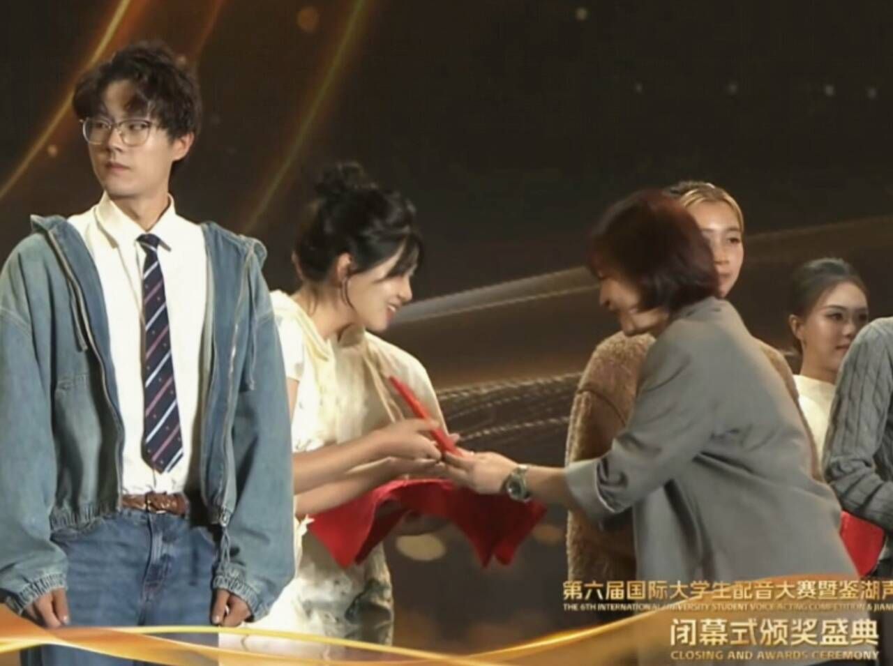 “从海选到决赛,学校和学院始终是我们的后盾。”谈及夺冠历程,张致铭说道。此次决赛最具挑战性的“消音片段二次创作”环节中,团队需将三个无关剧情无缝串联且精准对口型。由影视传媒学院张倩、牛士斌、高艺昕三位老师组成的专项指导团队全程护航,从情节梳理、情绪表达到技术调试,反复打磨剧本直至凌晨三点,最终团队凭借“真听真看真感觉”的细腻表达打动评委。