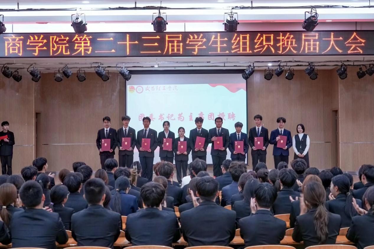 大会核心环节为选举工作。会上,宣读商学院第十五次学生会主席团候选人及学生委员会委员候选人预备名单,随后进行投票选举。投票结束后,第二十二届团委副书记孙文婧公布选举结果,邓省宝当选第十五届学生会执行主席并发表就职感言,承诺以“服务、担当、创新、务实”为准则,建立班级联络人、线上意见箱等沟通机制,加强内部培训与监督,确保工作透明高效。随后,大会进行第二十三届学生组织换届环节,熊文悦书记宣布任命通知并为主席团颁发聘书,新一届主席团成员为各部门部长颁发聘书,全体学生干部合影留念。此次大会既是团学工作的“接力站”,更是青年学子践行使命的“新起点”。